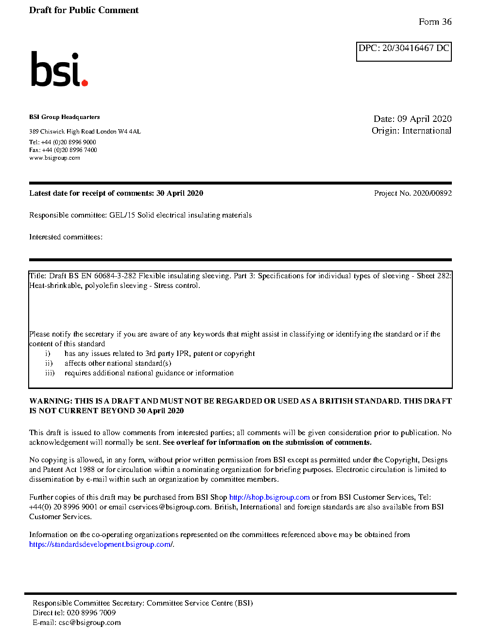 BS EN 60684-3-282. Flexible insulating sleeving Part 3. Specifications for individual types of sleeving. Sheet 282: Heat-shrinkable, polyolefin Stress control