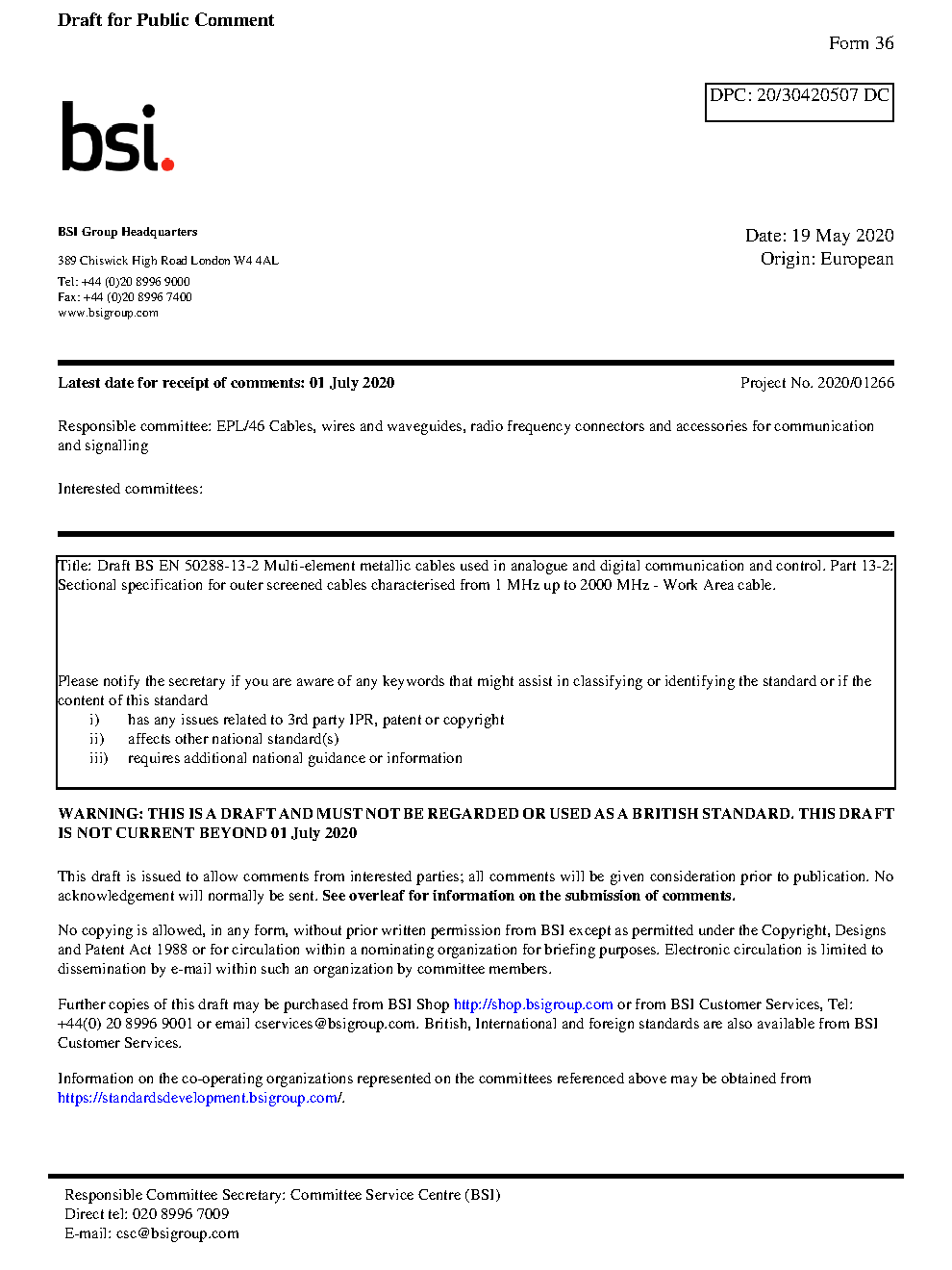 BS EN 50288-13-2. Multi-element metallic cables used in analogue and digital communication control Part 13-2. Sectional specification for outer screened characterised from 1 MHz up to 2000 MHz. Work Area cable