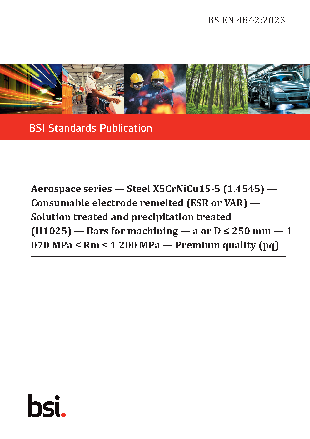 BS EN 4842. Aerospace series. Steel X5CrNiCu15-5 (WL 1.4545). Consumable electrode remelted (ESR or VAR). Solution treated and precipitation treated (H1025). Bars for machining. a or D = 250 mm. 1 070 MPa = Rm = 1 200 MPa. Premium quality (pq)