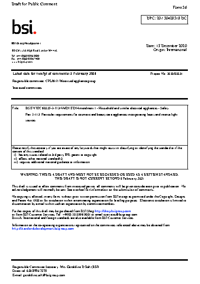 BS EN IEC 60335-2-113 AMD1. Household and similar electrical appliances. Safety Part 2-113. Particular requirements for cosmetic beauty care appliances incorporating lasers intense light sources