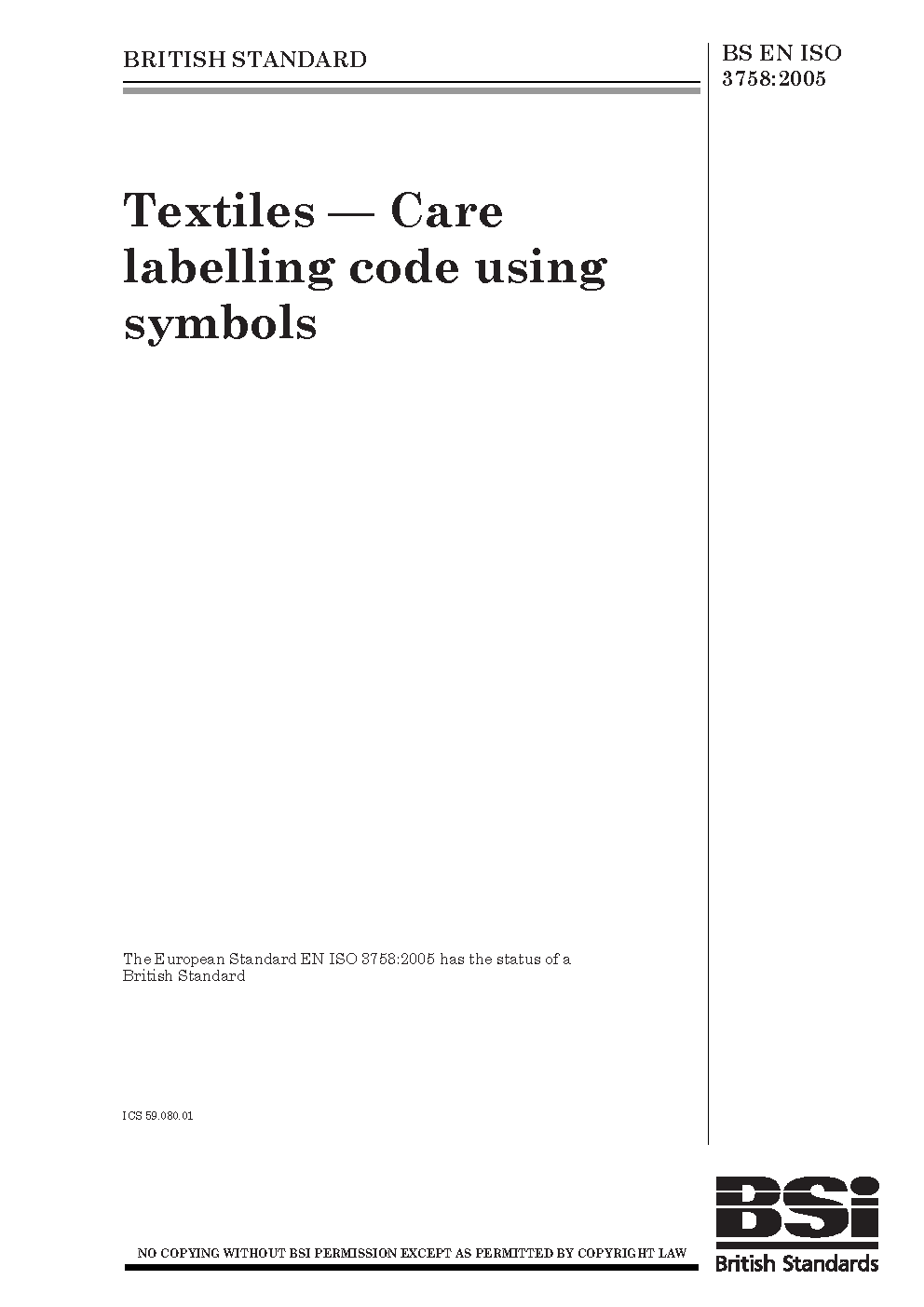 BS EN ISO 3758. Textiles. Care labelling code using symbols