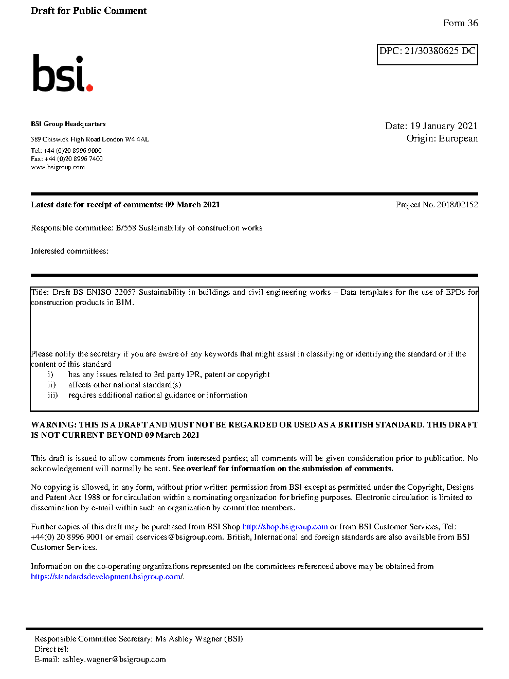 BS EN ISO 22057. Sustainability in buildings and civil engineering works. Data templates for the use of EPDs for construction products in BIM