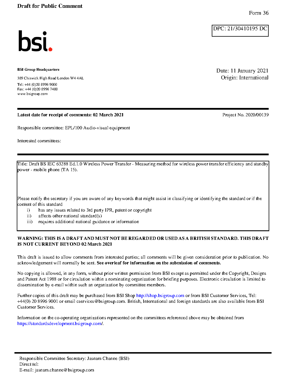 BS IEC 63288. Wireless Power Transfer. Measuring method for wireless power transfer efficiency and standby power. mobile phone (TA 15)