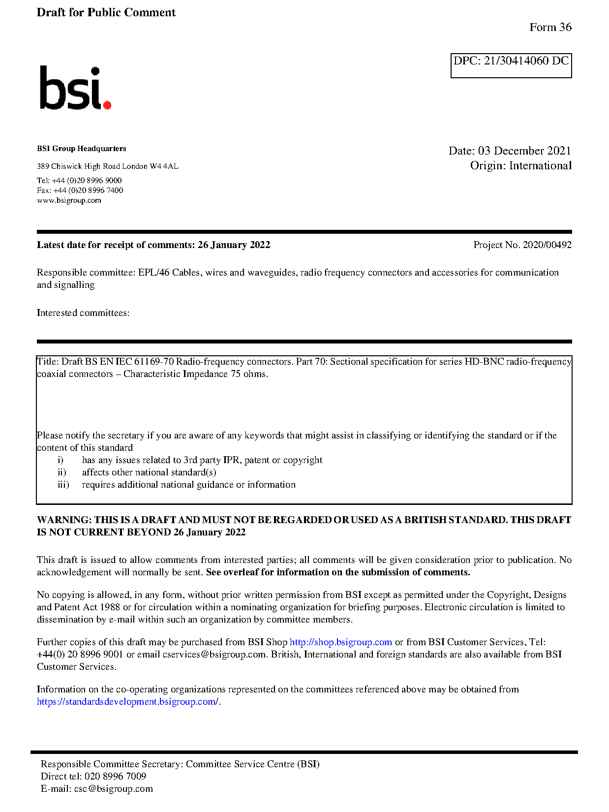 BS EN IEC 61169-70. Radio-frequency connectors Part 70. Sectional specification for series HD-BNC radio-frequency coaxial connectors. Characteristic Impedance 75 ohms