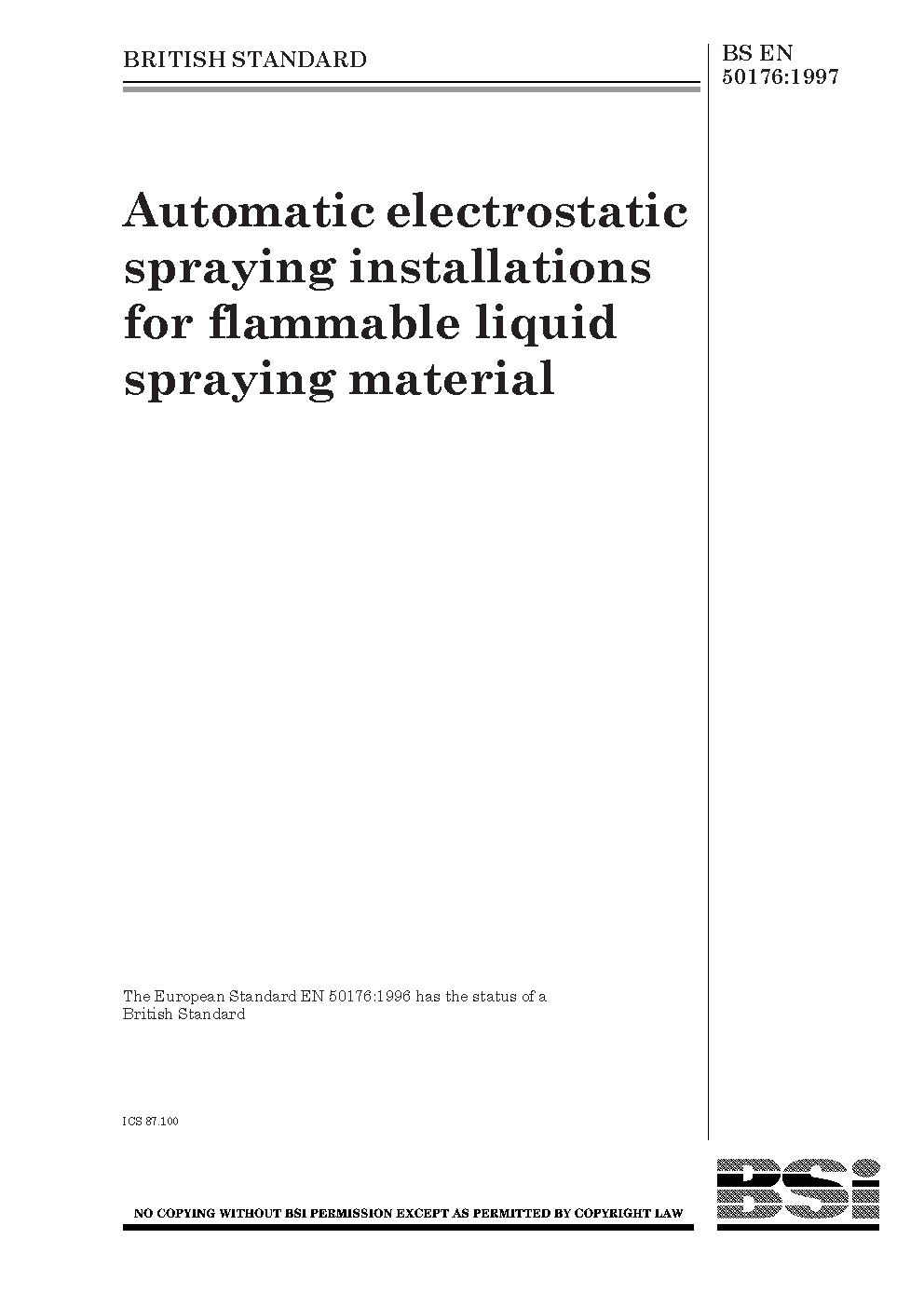 BS EN 50176. Automatic electrostatic application systems for ignitable coating materials. Safety requirements