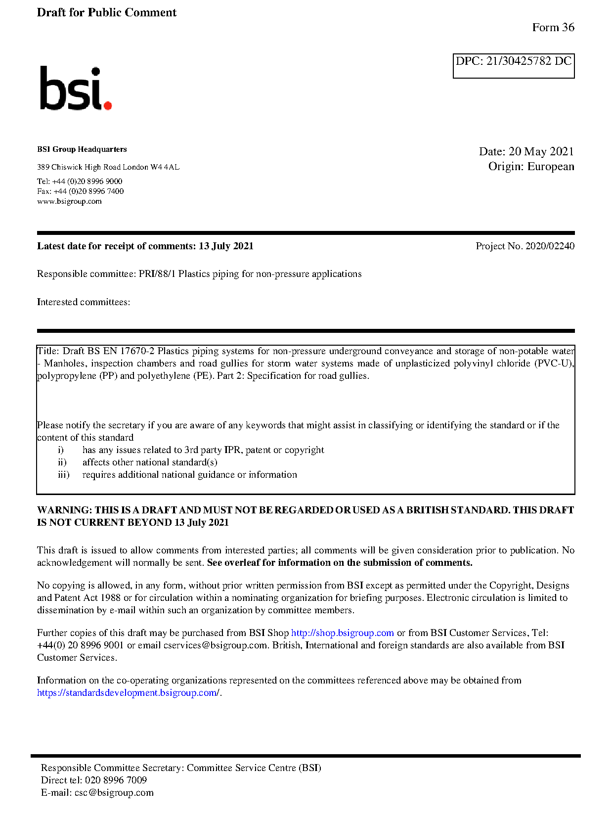 BS EN 17670-2. Plastics piping systems for non-pressure underground conveyance and storage of non-potable water. Manholes, inspection chambers road gullies storm water made unplasticized polyvinyl chloride (PVC-U), polypropylene (PP) polyethylene (PE) Part 2. Specification