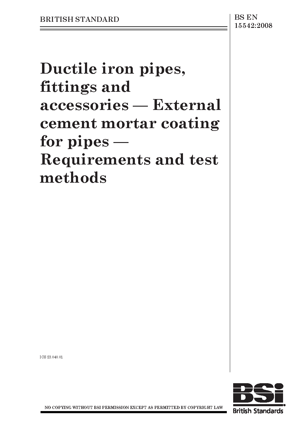 BS EN 15542. Ductile iron pipes, fittings and accessories. External cement mortar coating for pipes. Requirements and test methods