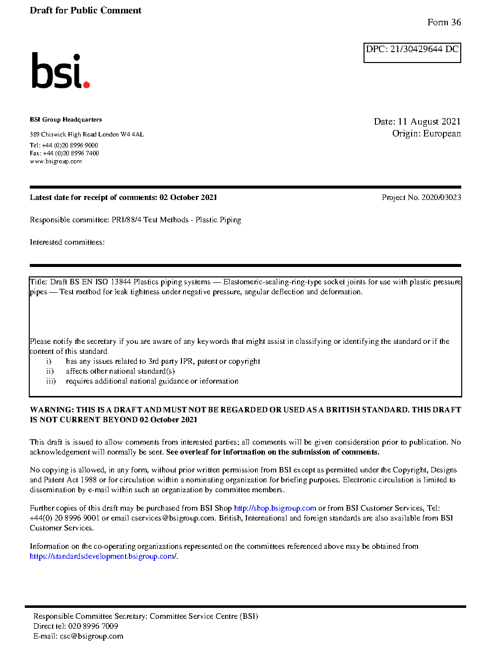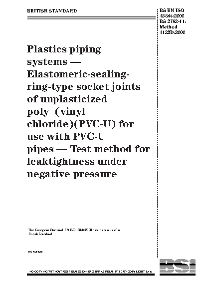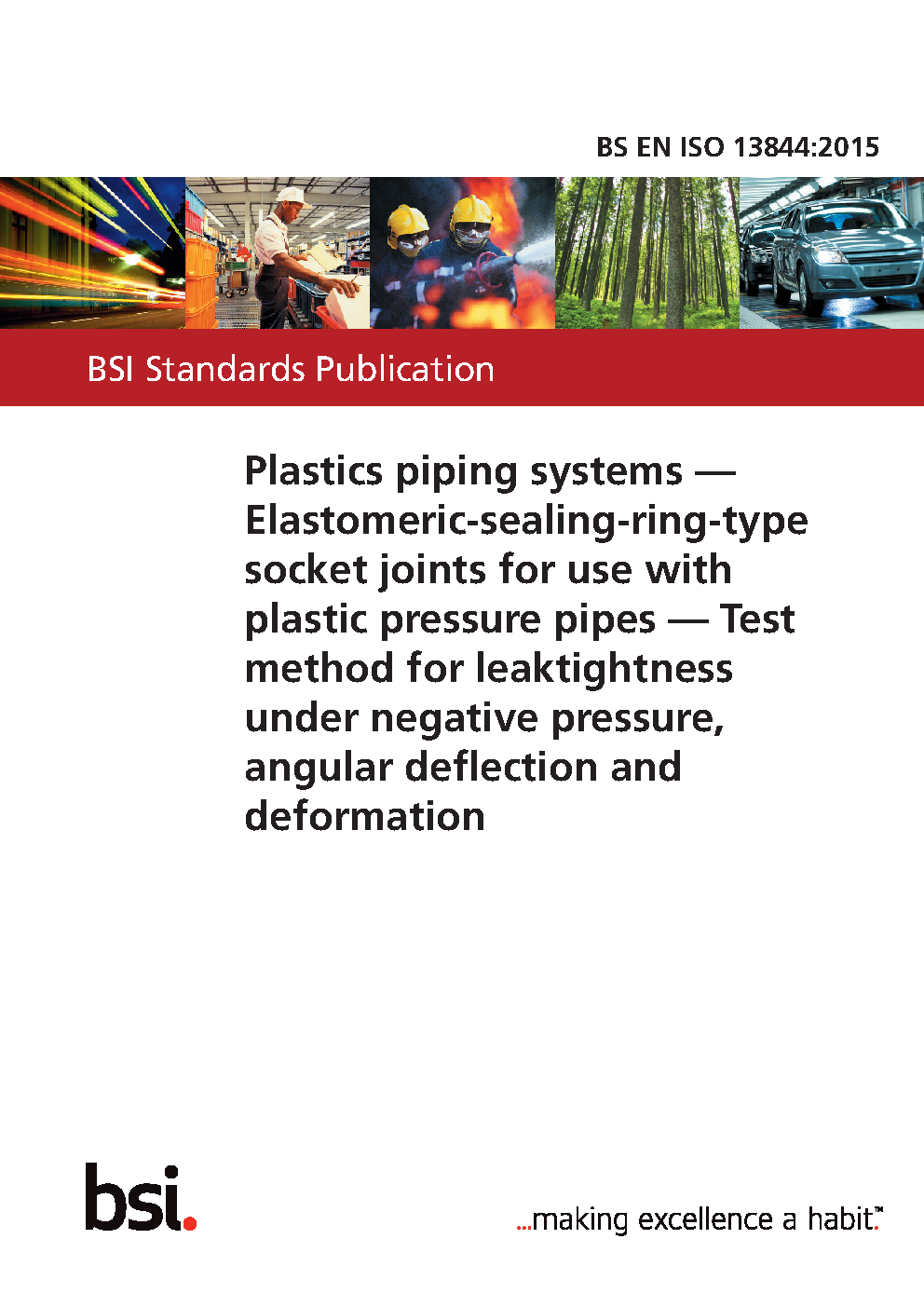 BS EN ISO 13844. Plastics piping systems. Elastomeric-sealing-ring-type socket joints for use with plastic pressure pipes. Test method for leak tightness under negative pressure, angular deflection and deformation