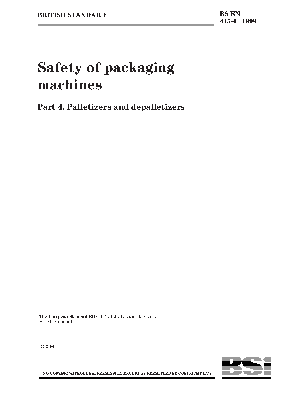 BS EN 415-4. Safety of packaging machines Part 4. Palletizers and depalletizers associated equipment