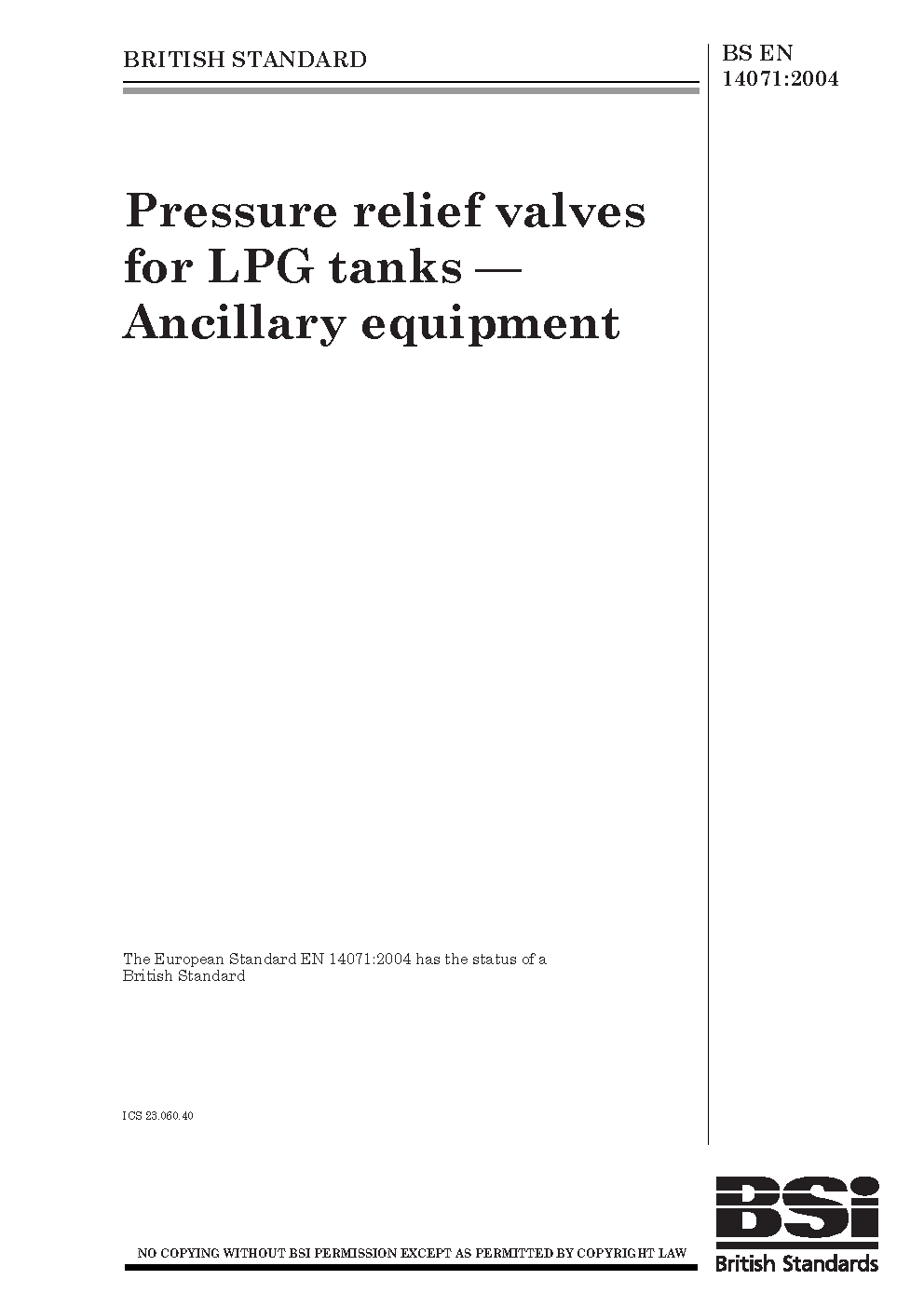 BS EN 14071. LPG equipment and accessories. Pressure relief valves for LPG pressure vessels. Ancillary equipment