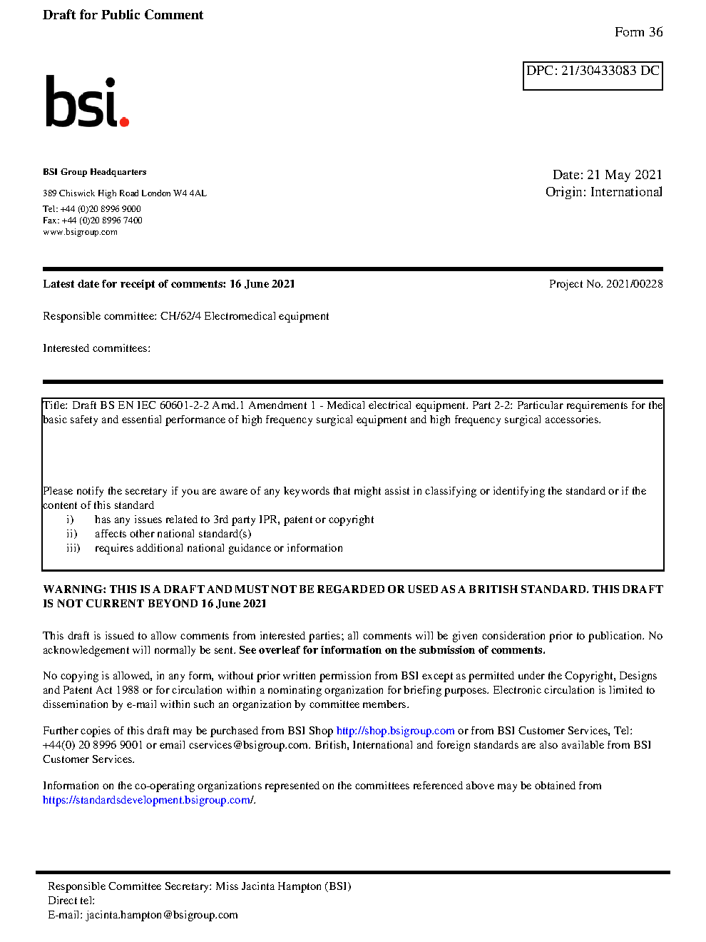 BS EN IEC 60601-2-2 AMD1. Medical electrical equipment Part 2-2. Particular requirements for the basic safety and essential performance of high frequency surgical accessories