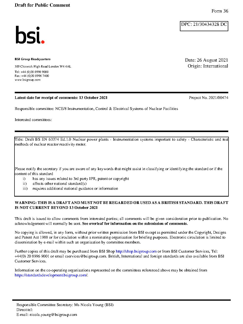 BS EN 63374. Nuclear power plants. Instrumentation systems important to safety. Characteristic and test methods of nuclear reactor reactivity meter