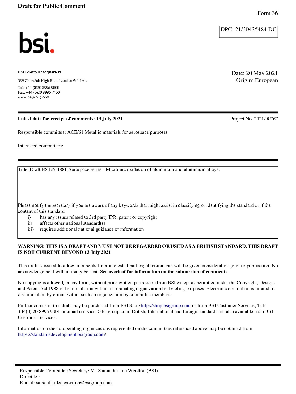 BS EN 4881. Aerospace series. Micro-arc oxidation of aluminium and aluminium alloys