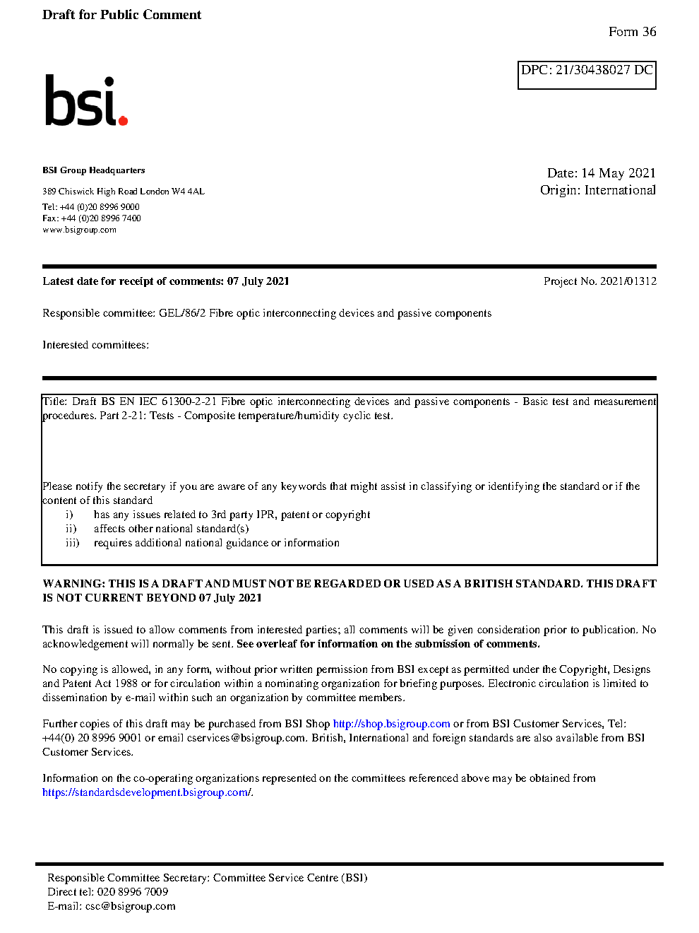 BS EN IEC 61300-2-21. Fibre optic interconnecting devices and passive components. Basic test measurement procedures Part 2-21. Tests. Composite temperature/humidity cyclic