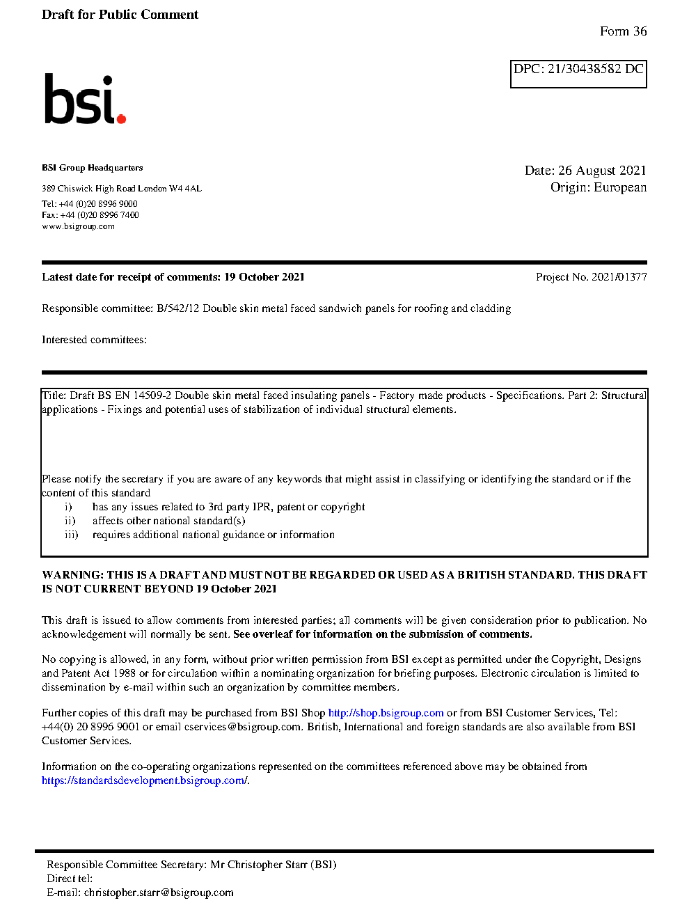 BS EN 14509-2. Double skin metal faced insulating panels. Factory made products. Specifications Part 2. Structural applications. Fixings and potential uses of stabilization individual structural elements