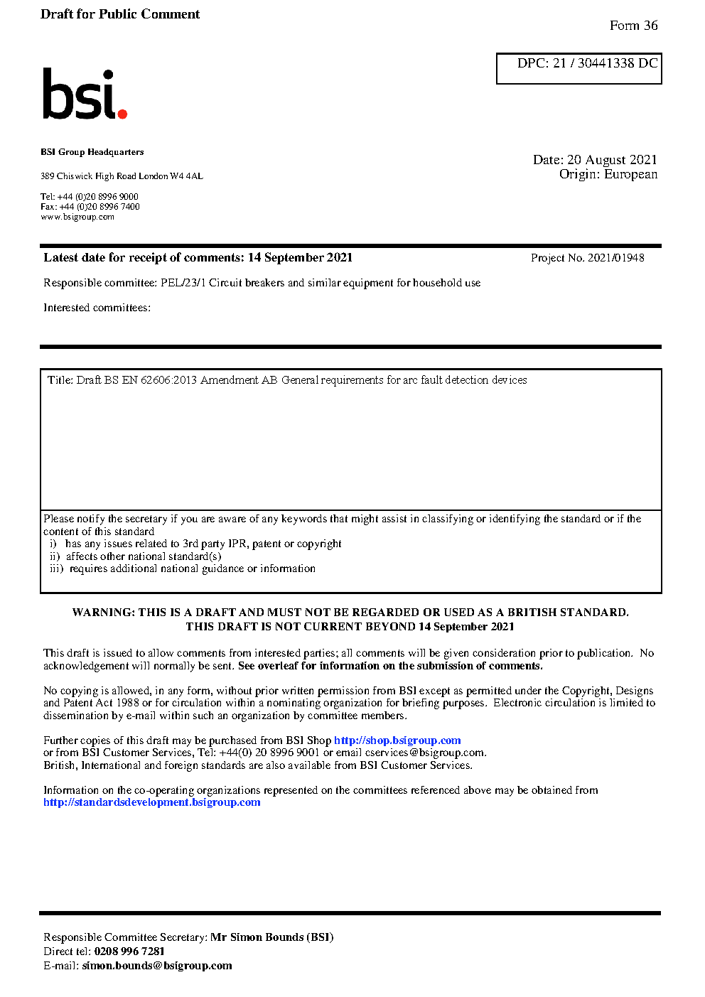 BS EN 62606 AMD AB. General requirements for arc fault detection devices