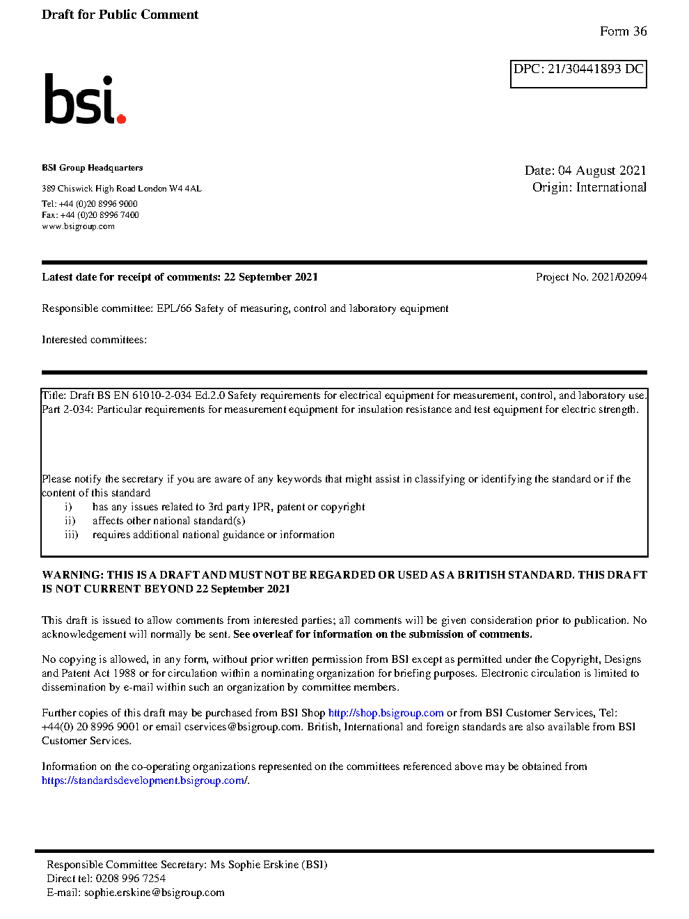 BS EN 61010-2-034. Safety requirements for electrical equipment measurement, control, and laboratory use Part 2-034. Particular measurement insulation resistance test electric strength