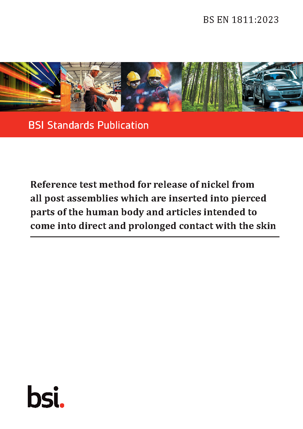 BS EN 1811. Reference test method for release of nickel from all post assemblies which are inserted into pierced parts of the human body and articles intended to come into direct and prolonged contact with the skin