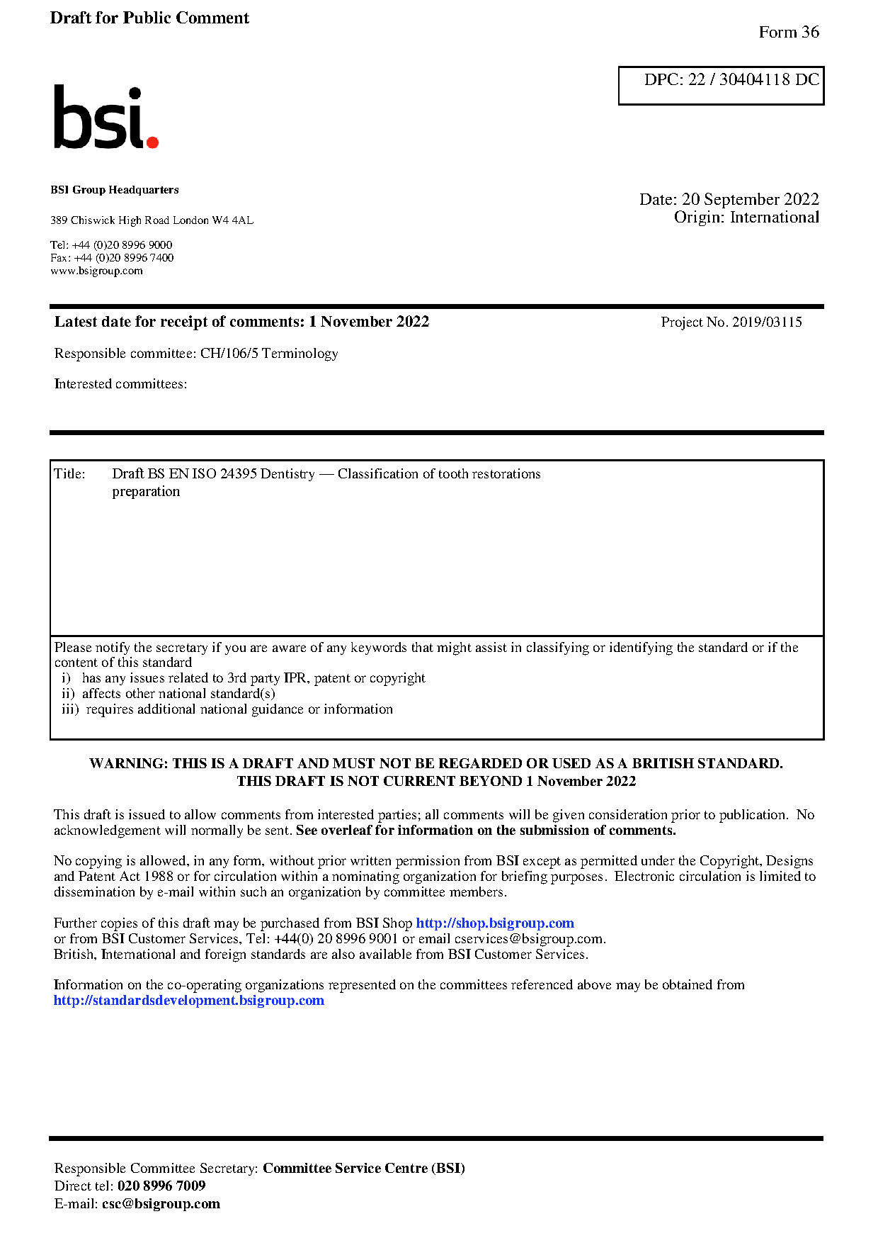 BS EN ISO 24395. Dentistry. Classification of tooth restorations’