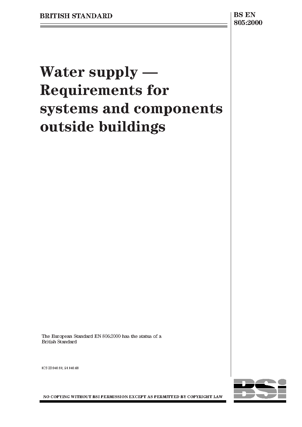 BS EN 805. Water supply. Requirements for systems and components outside buildings