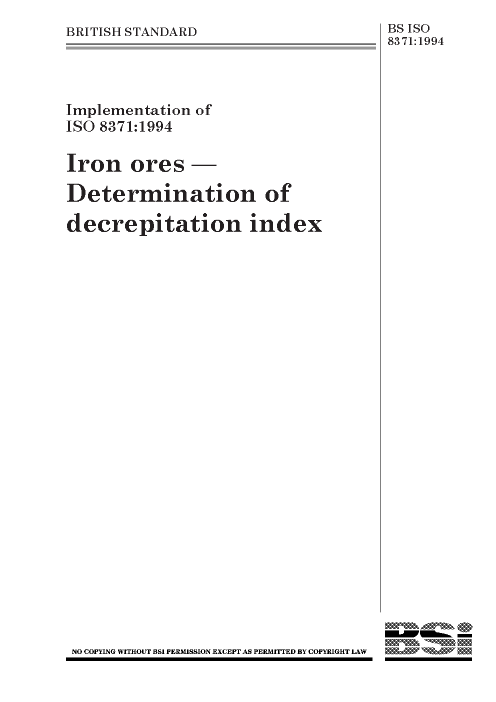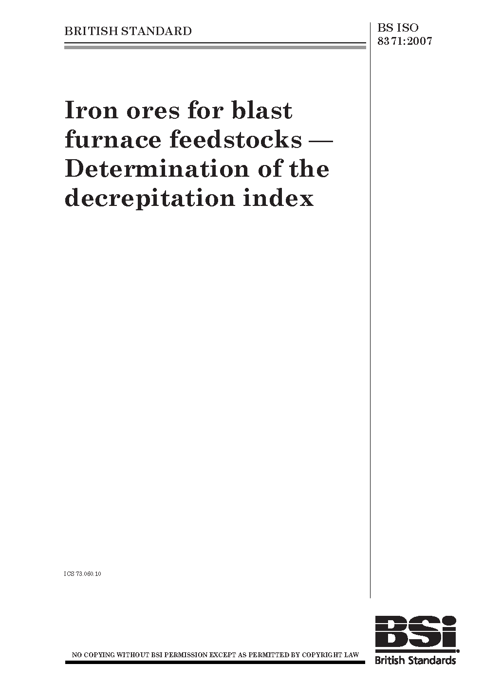 BS ISO 8371. Iron ores for blast furnace feedstocks. Determination of the decrepitation index