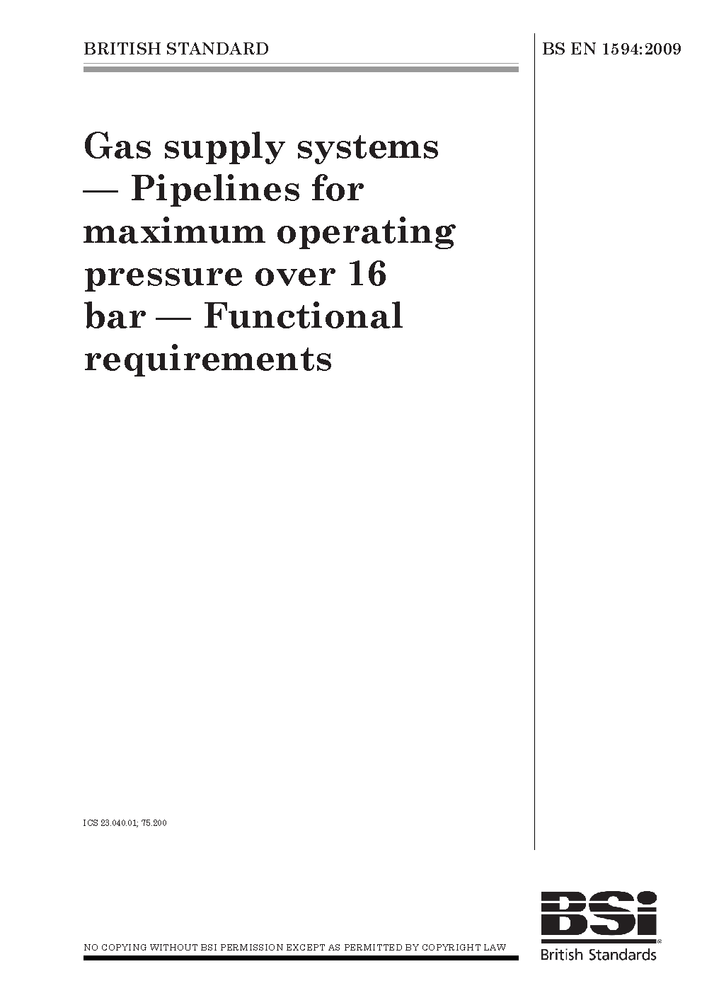 BS EN 1594. Gas infrastructure. Pipelines for maximum operating pressure over 16 bar. Functional requirements