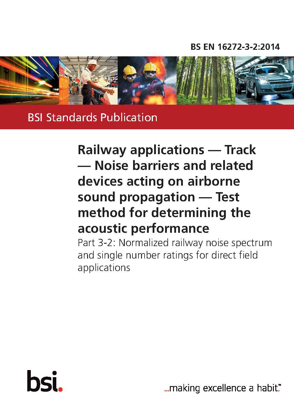 BS EN 16272-3-2. Railway applications. Infrastructure. Noise barriers and related devices acting on airborne sound propagation. Test method for determining the acoustic performance Part 3-2. Normalized railway noise spectrum single number ratings direct field applications