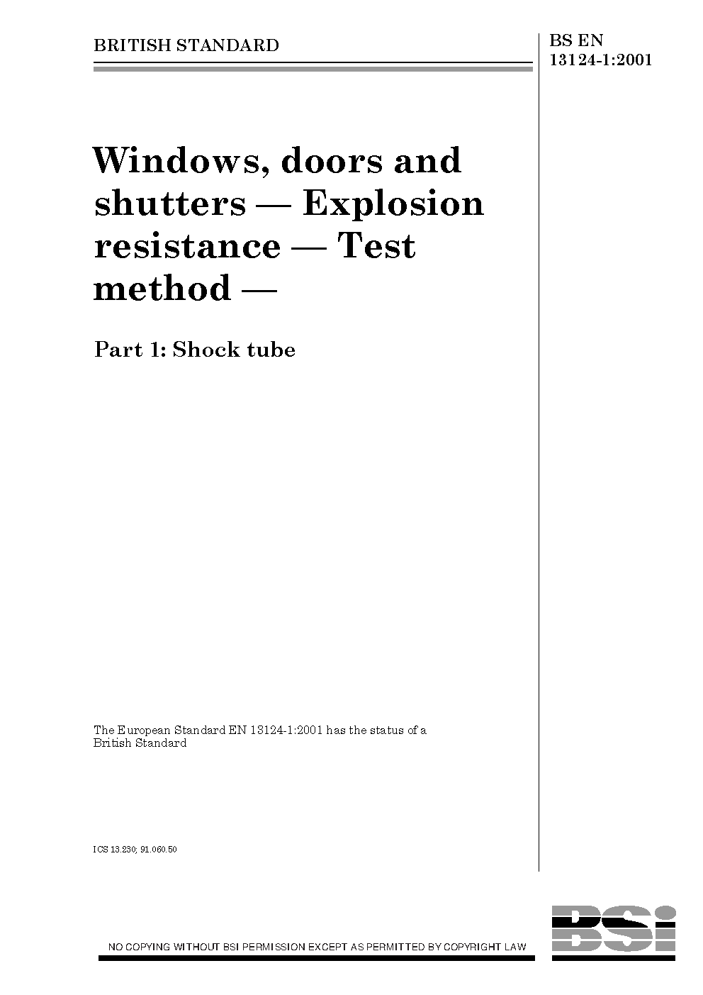 BS EN 13124-1. Windows, doors, shutters and curtain walling. Explosion resistance. Test method Part 1. Shock tube
