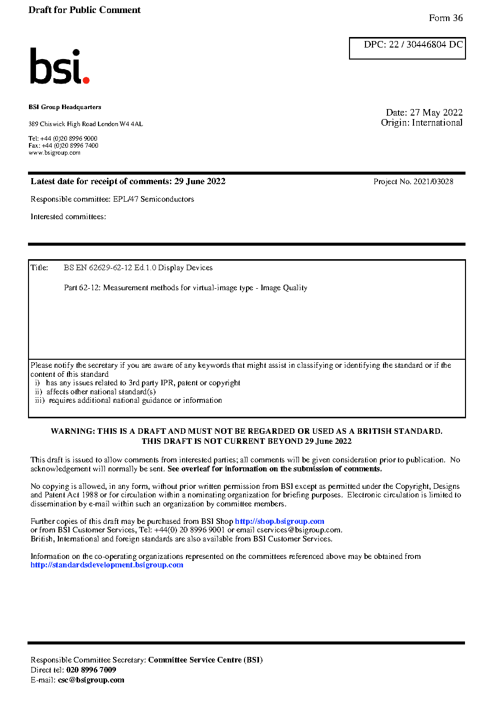 BS EN 62629-62-12. Display Devices Part 62-12. Measurement methods for virtual-image type. Image Quality