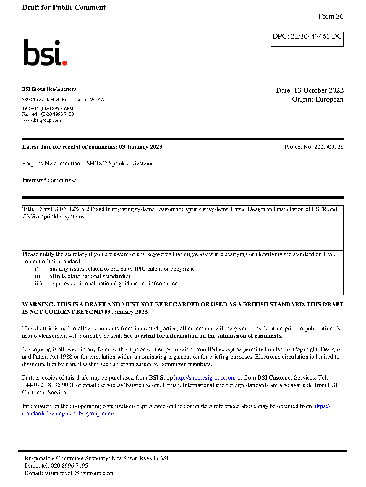 BS EN 12845-2. Fixed firefighting systems. Automatic sprinkler systems Part 2. Design and installation of ESFR CMSA