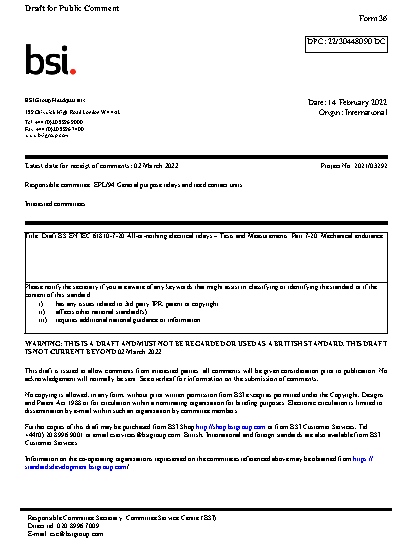 BS EN IEC 61810-7-20. All-or-nothing electrical relays. Tests and Measurements Part 7-20. Mechanical endurance