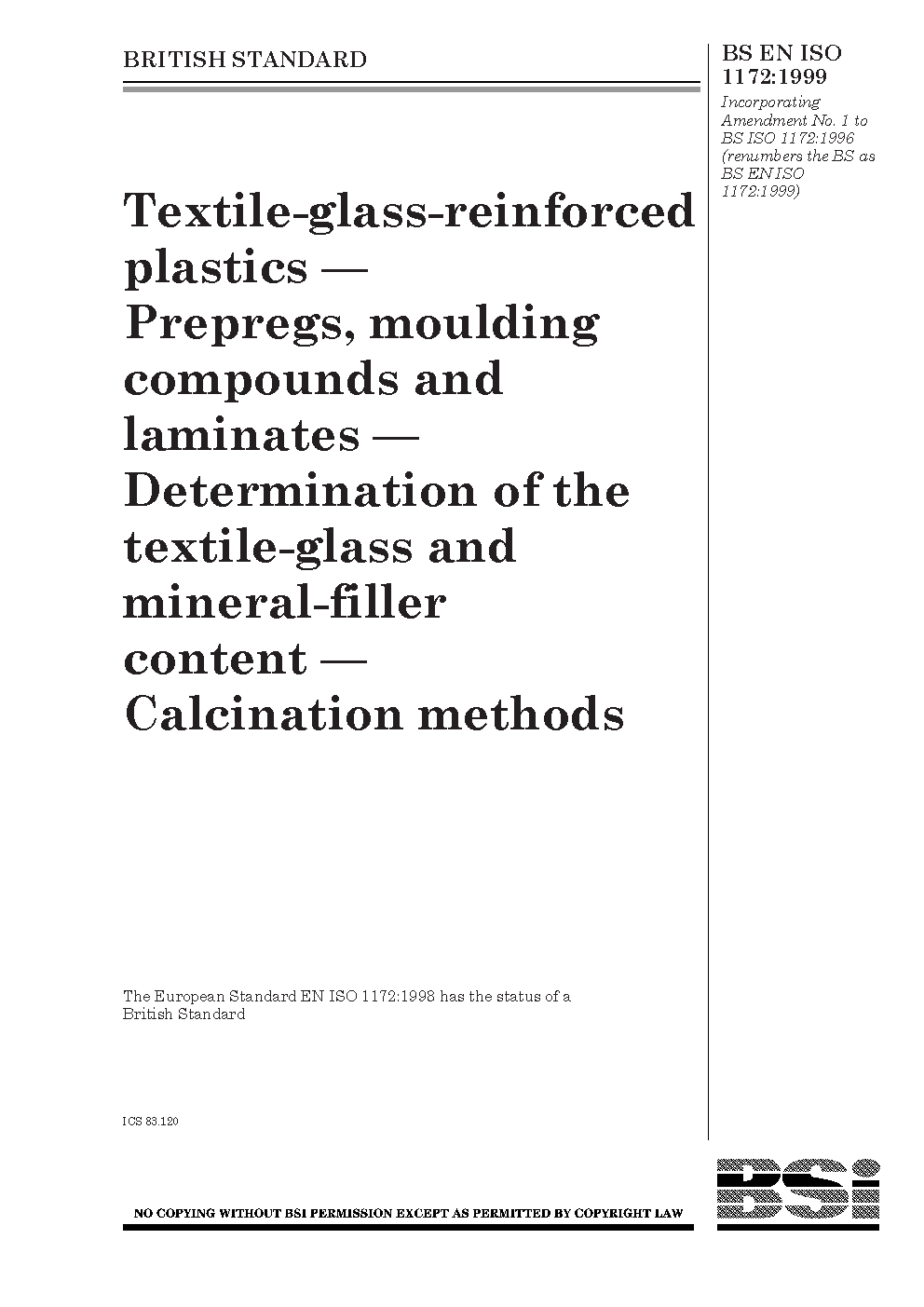 BS EN ISO 1172. Textile-glass-reinforced plastics. Prepregs, moulding compounds and laminates. Determination of the textile glass and mineral-filler content. Calcination methods