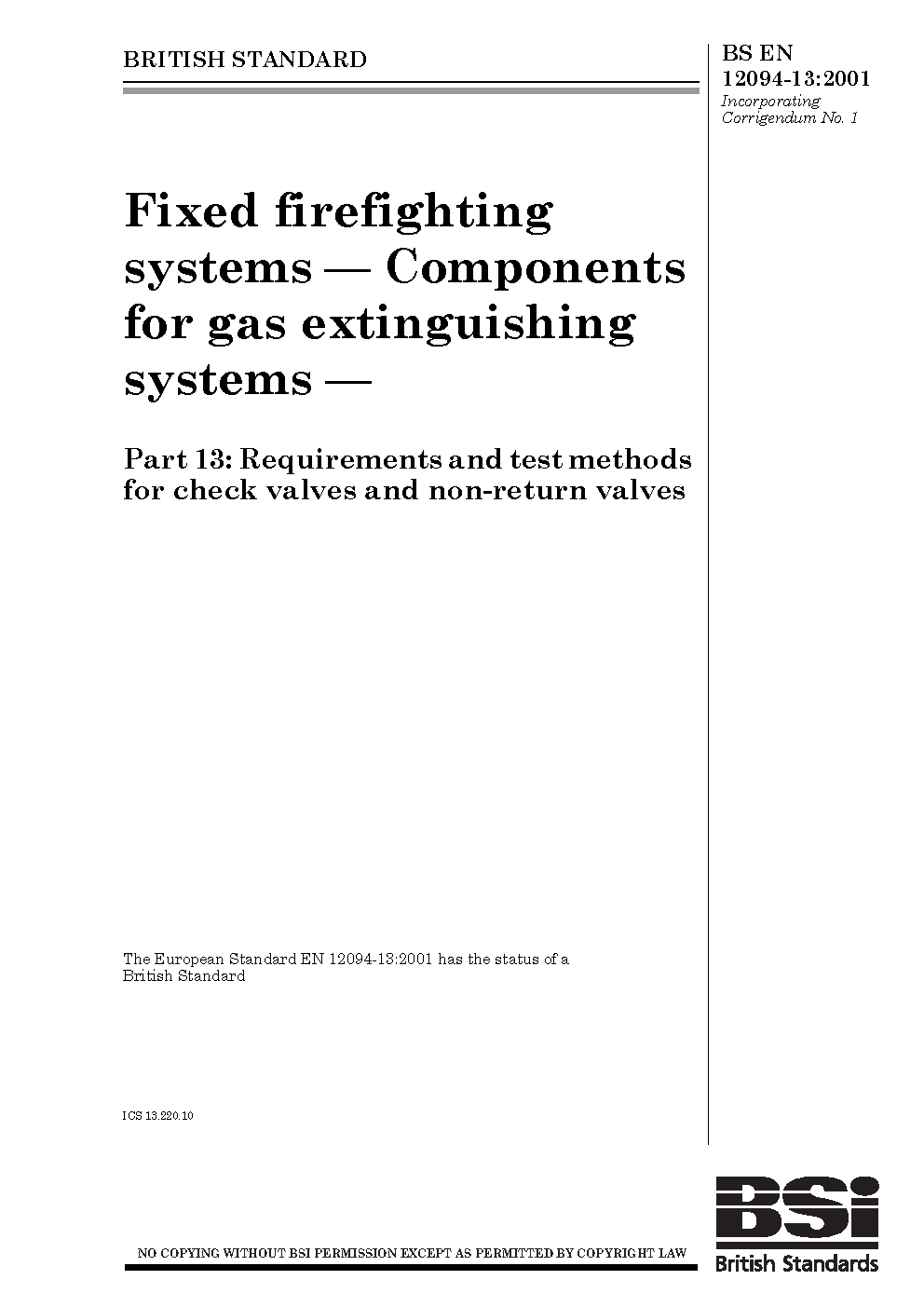 BS EN 12094-13. Fixed firefighting systems. Components for gas extinguishing systems Part 13. Characteristics check valves and non-return