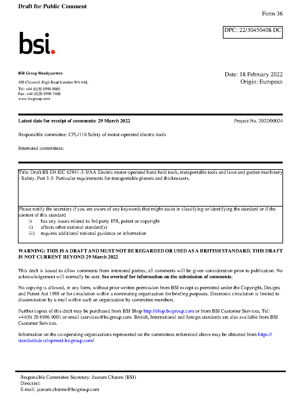 BS EN IEC 62841-3-3. Electric motor-operated hand-held tools, transportable tools and lawn garden machinery. Safety Part 3-3. Particular requirements for planers thicknessers