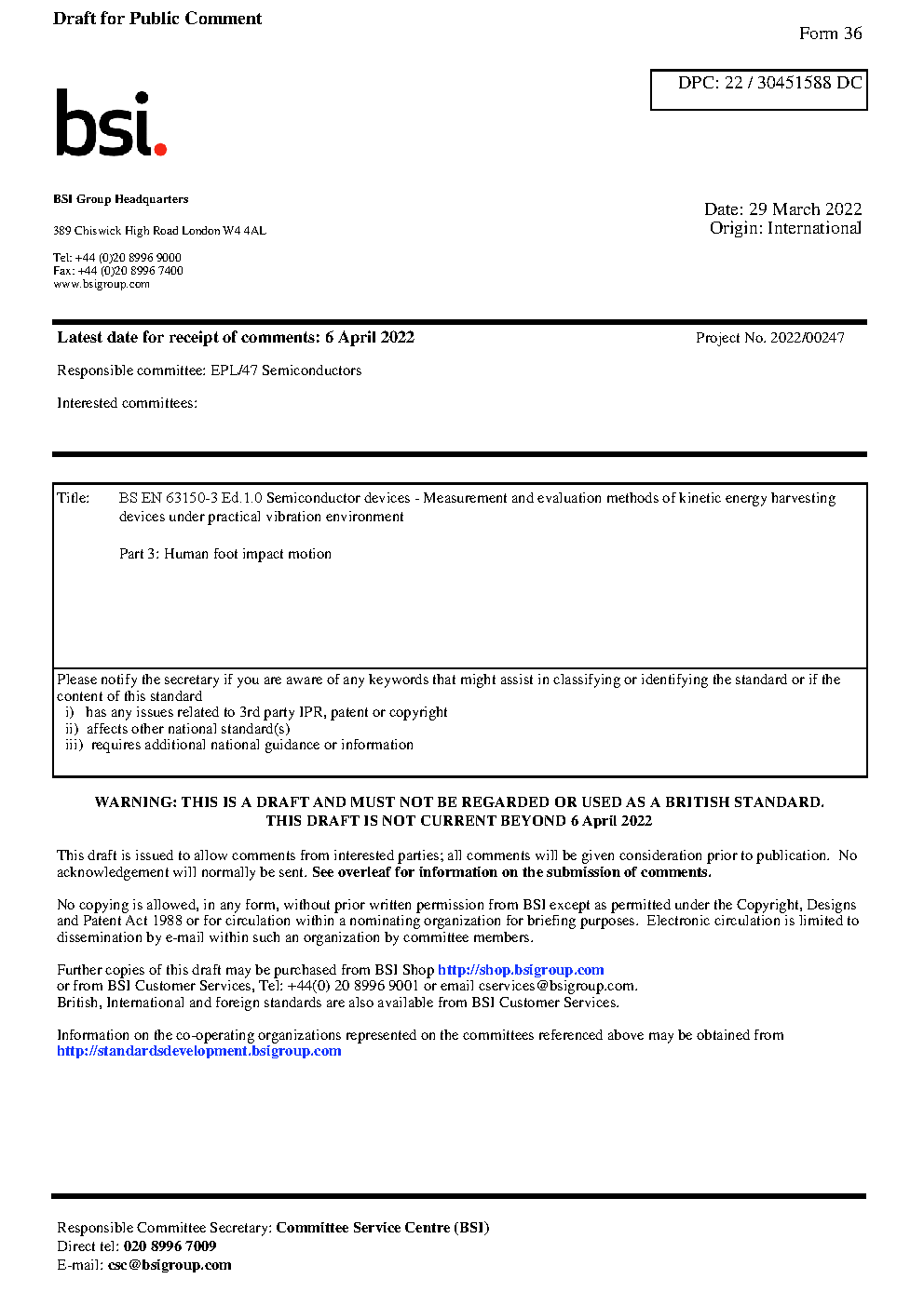 BS EN 63150-3 Ed.1.0. Semiconductor devices. Measurement and evaluation methods of kinetic energy harvesting devices under practical vibration environment Part 3. Human foot impact motion