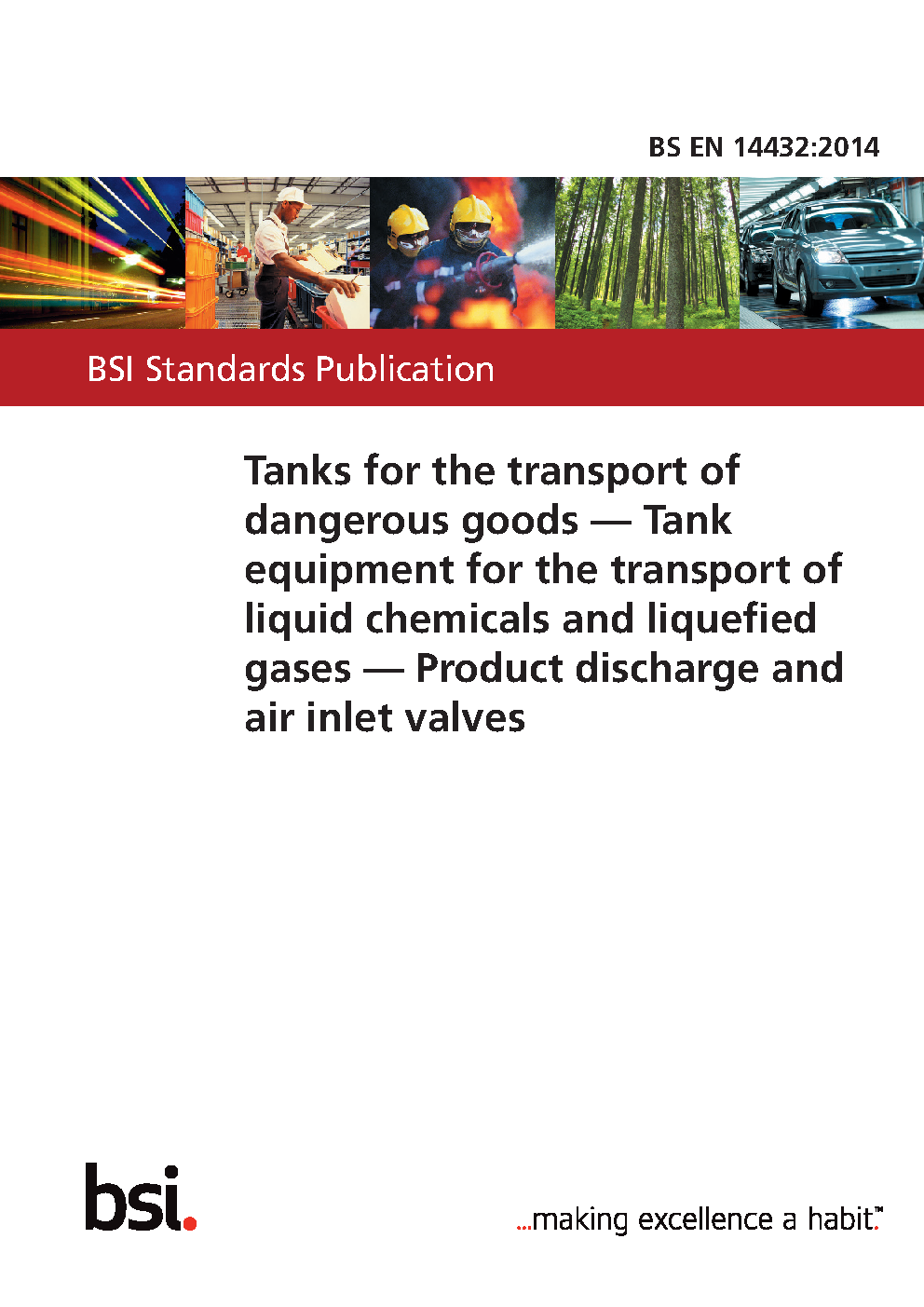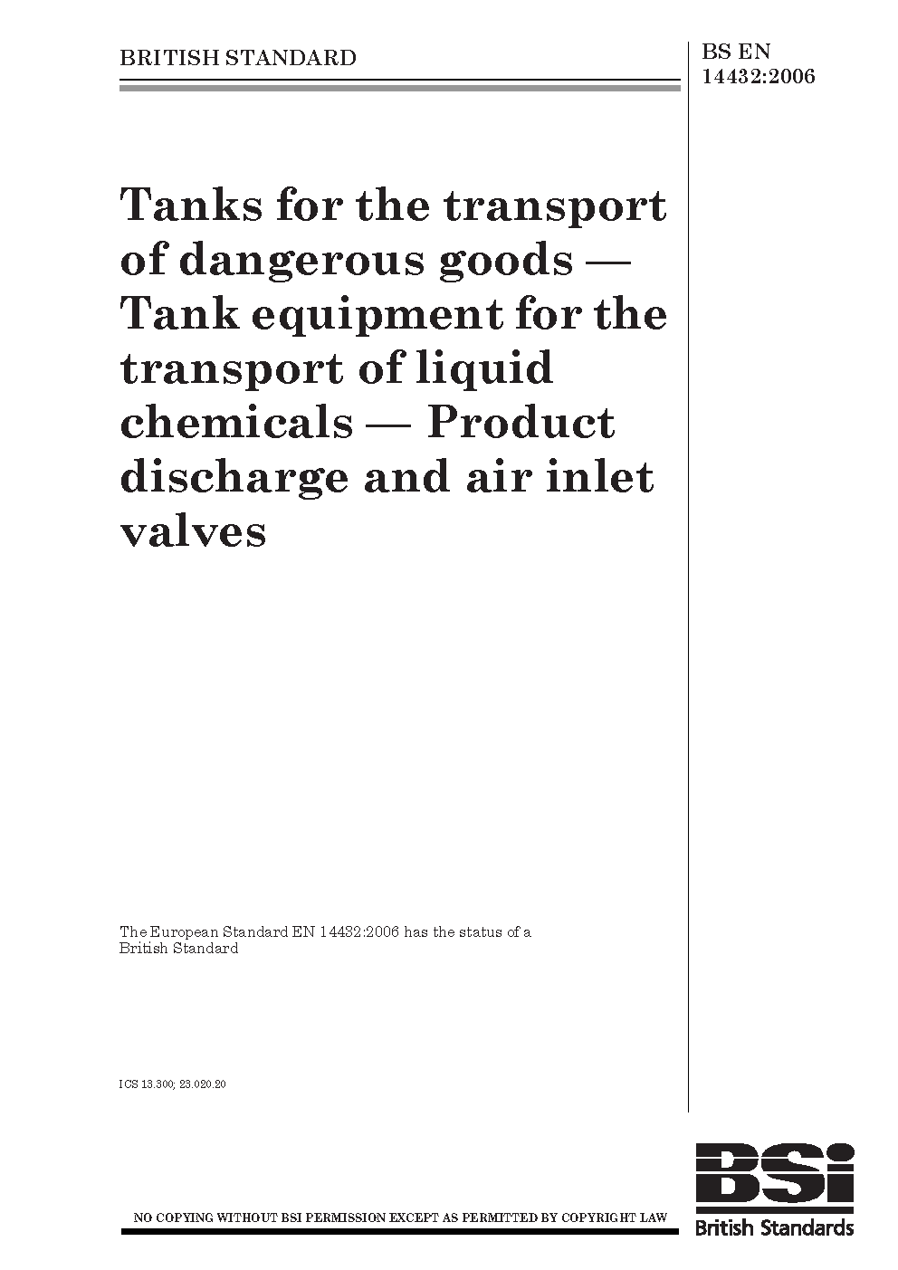BS EN 14432. Tanks for the transport of dangerous goods. Tank equipment for the transport of liquid chemicals and liquefied gases. Product discharge and air inlet valves