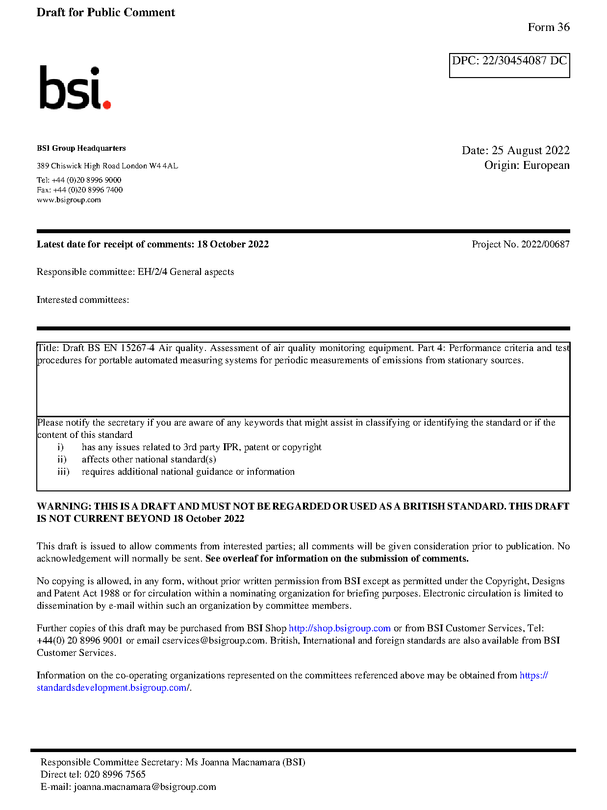 BS EN 15267-4. Air quality. Assessment of air quality monitoring equipment. Part 4. Performance criteria and test procedures for portable automated measuring systems periodic measurements emissions from stationary sources