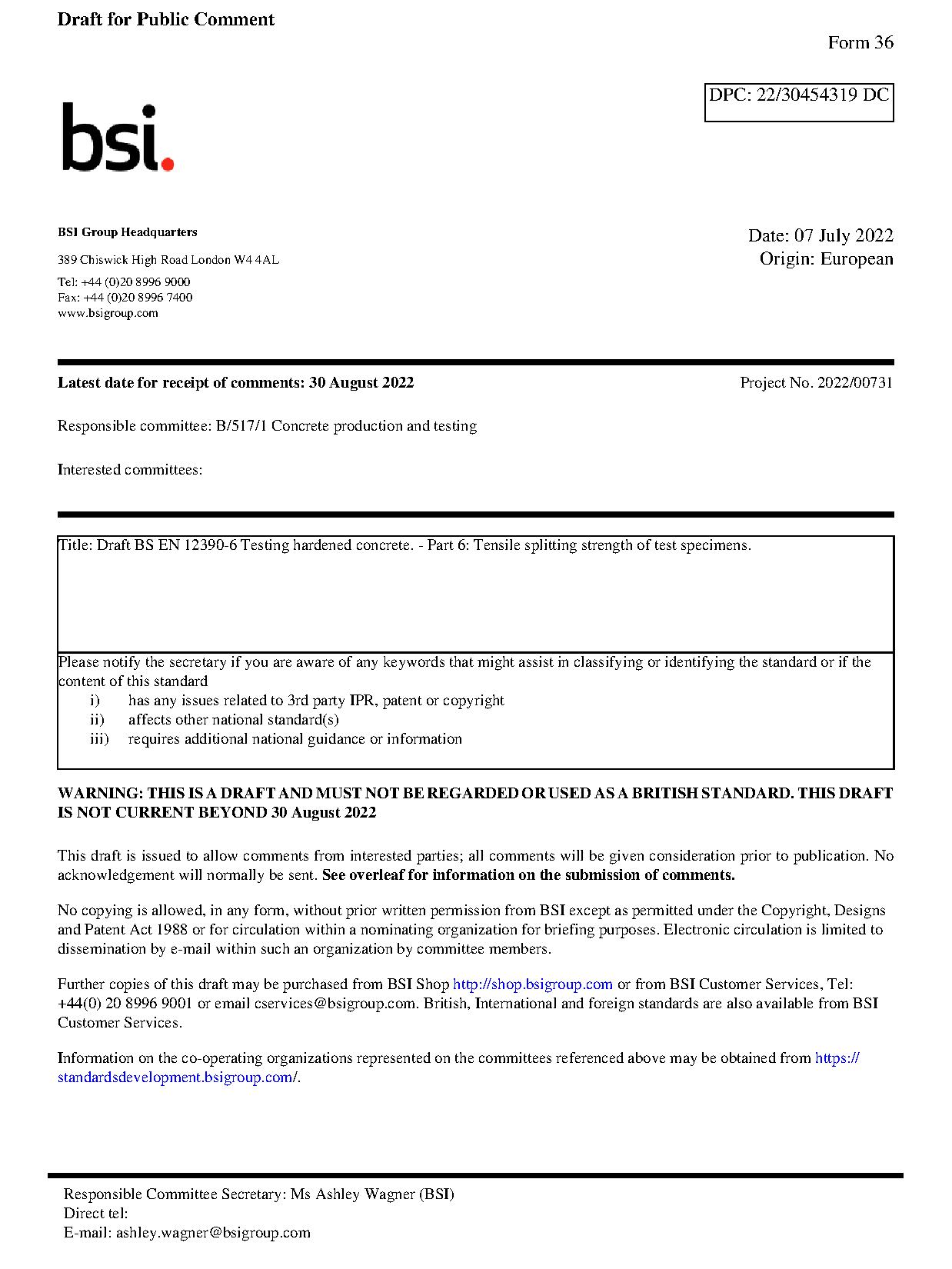 BS EN 12390-6. Testing hardened concrete Part 6. Tensile splitting strength of test specimens