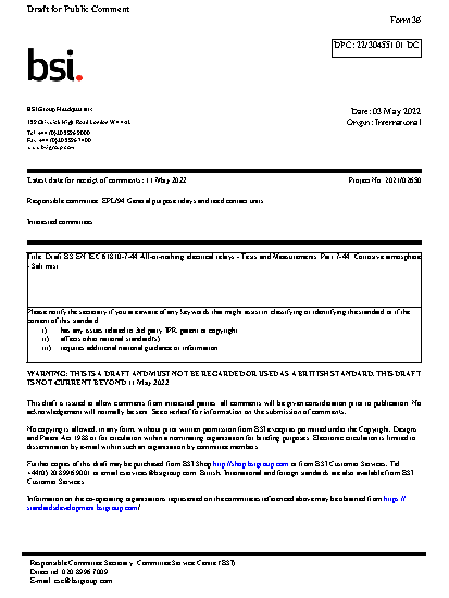 BS EN IEC 61810-7-44. All-or-nothing electrical relays. Tests and Measurements Part 7-44. Corrosive atmosphere. Salt mist