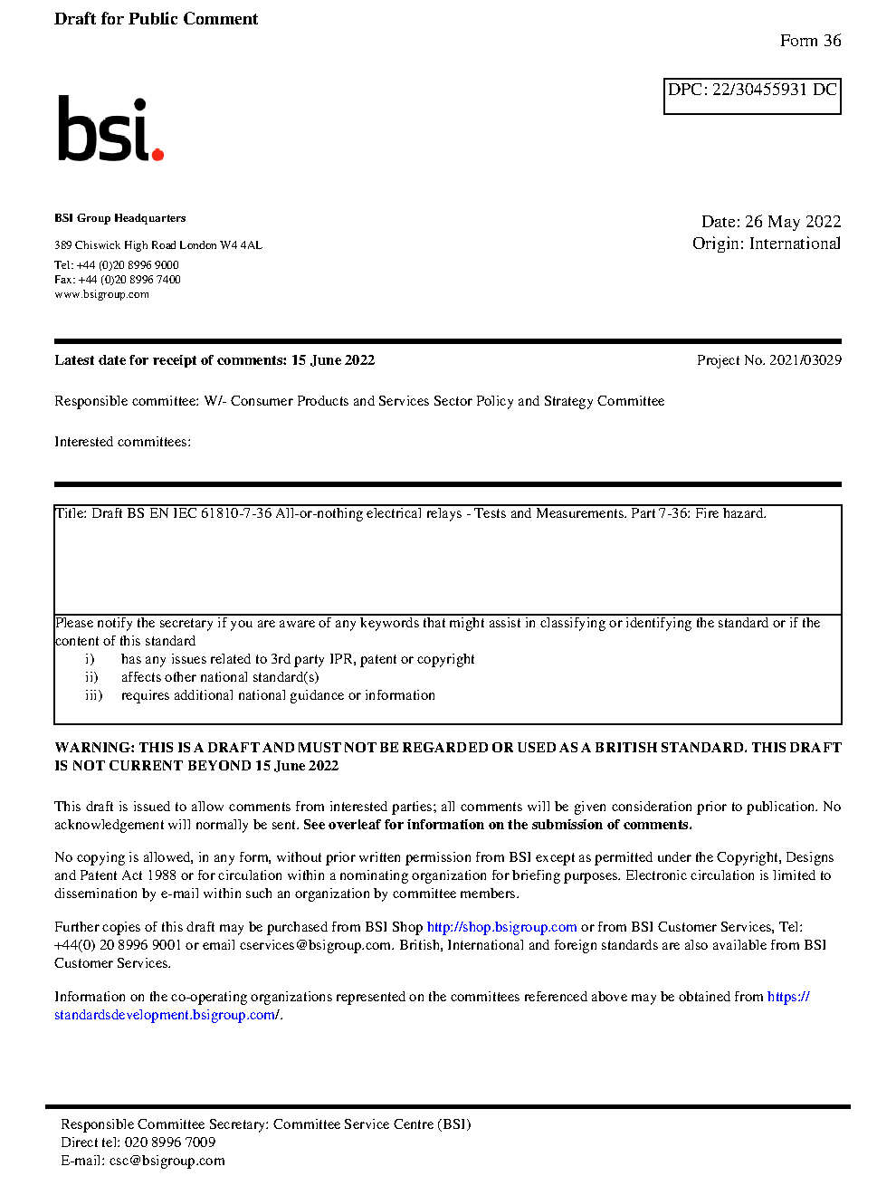 BS EN IEC 61810-7-36. All-or-nothing electrical relays. Tests and Measurements Part 7-36. Fire hazard
