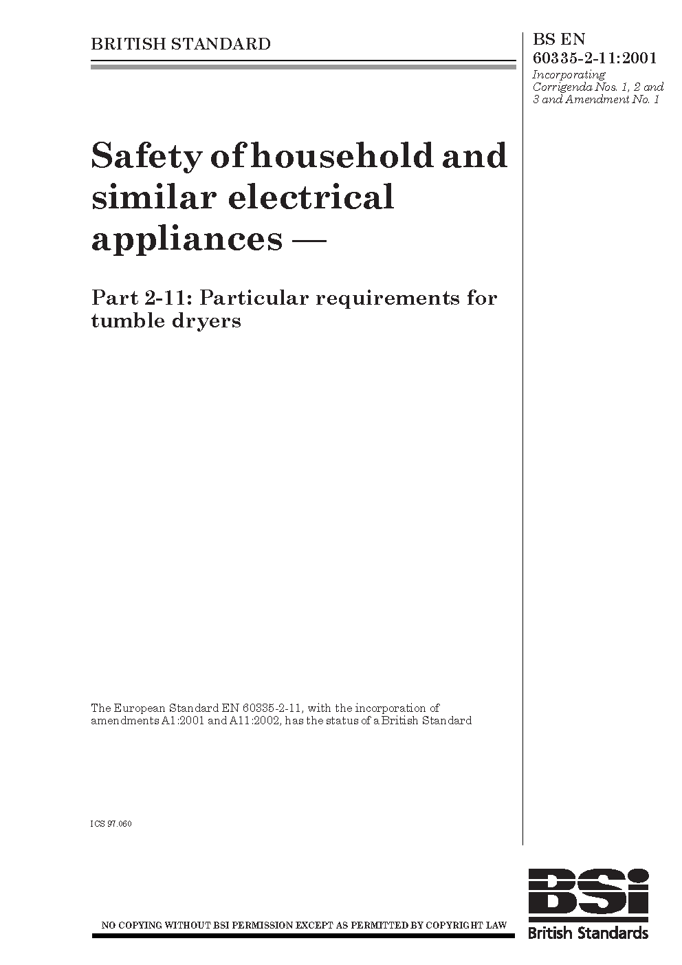BS EN 60335-2-11. Household and similar electrical appliances. Safety Part 2-11. Particular requirements for tumble dryers