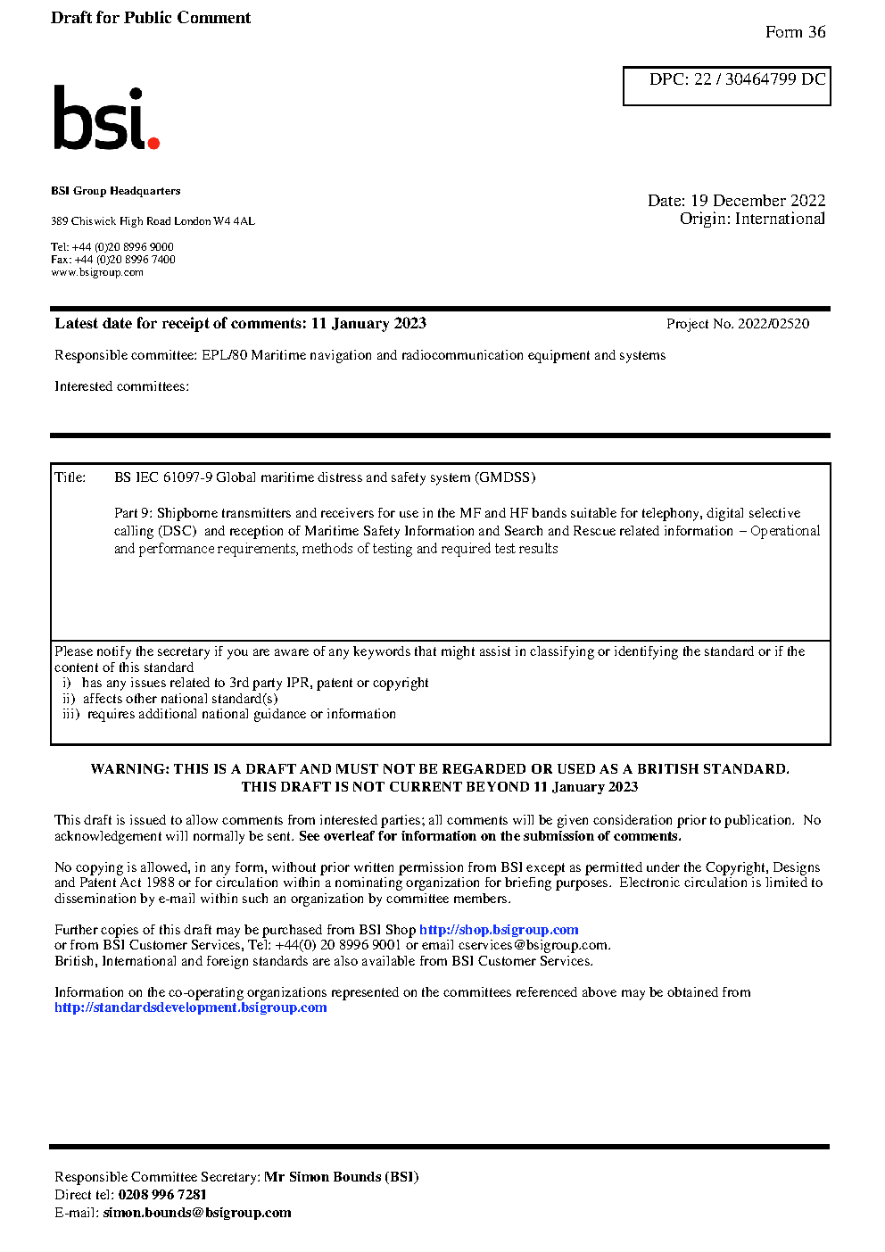 BS IEC 61097-9. Global maritime distress and safety system (GMDSS) Part 9. Shipborne transmitters receivers for use in the MF HF bands suitable telephony, digital selective calling (DSC) reception of Maritime Safety Information Search Rescue related information. Operational performance requirements, methods testing required test results