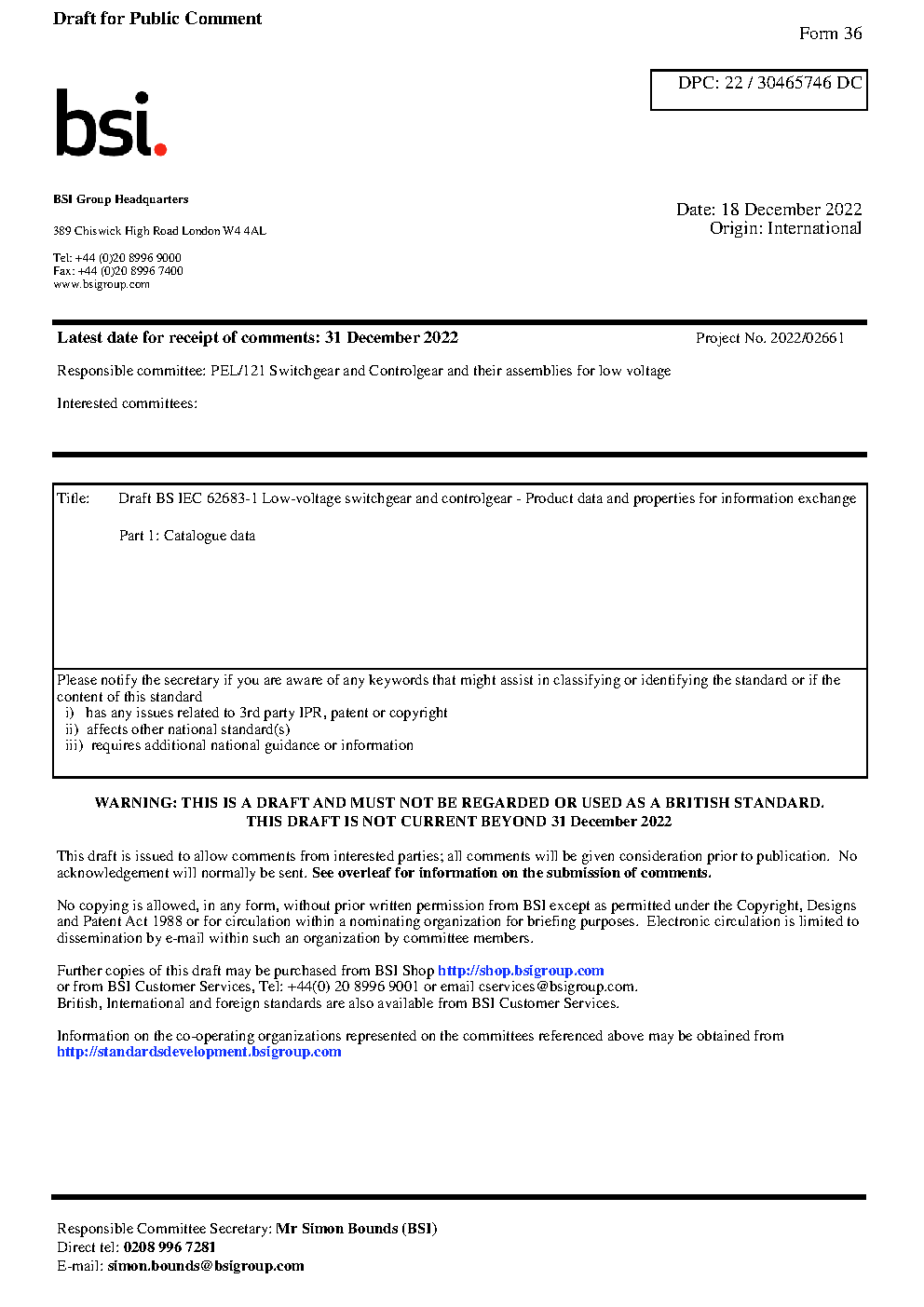 BS IEC 62683-1. Low-voltage switchgear and controlgear. Product data properties for information exchange Part 1. Catalogue