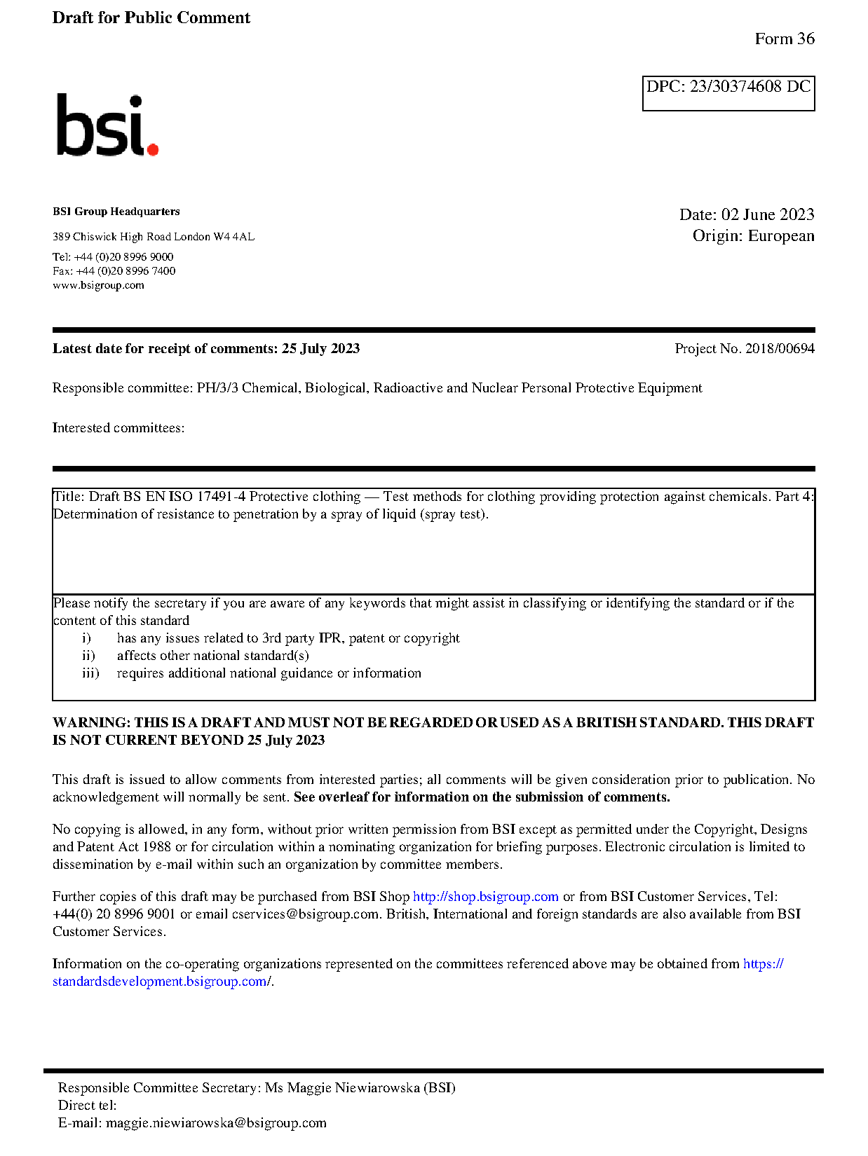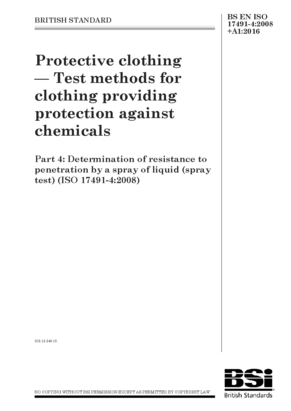 BS EN ISO 17491-4. Protective clothing. Test methods for clothing providing protection against chemicals Part 4. Determination of resistance to penetration by a spray liquid (spray test)