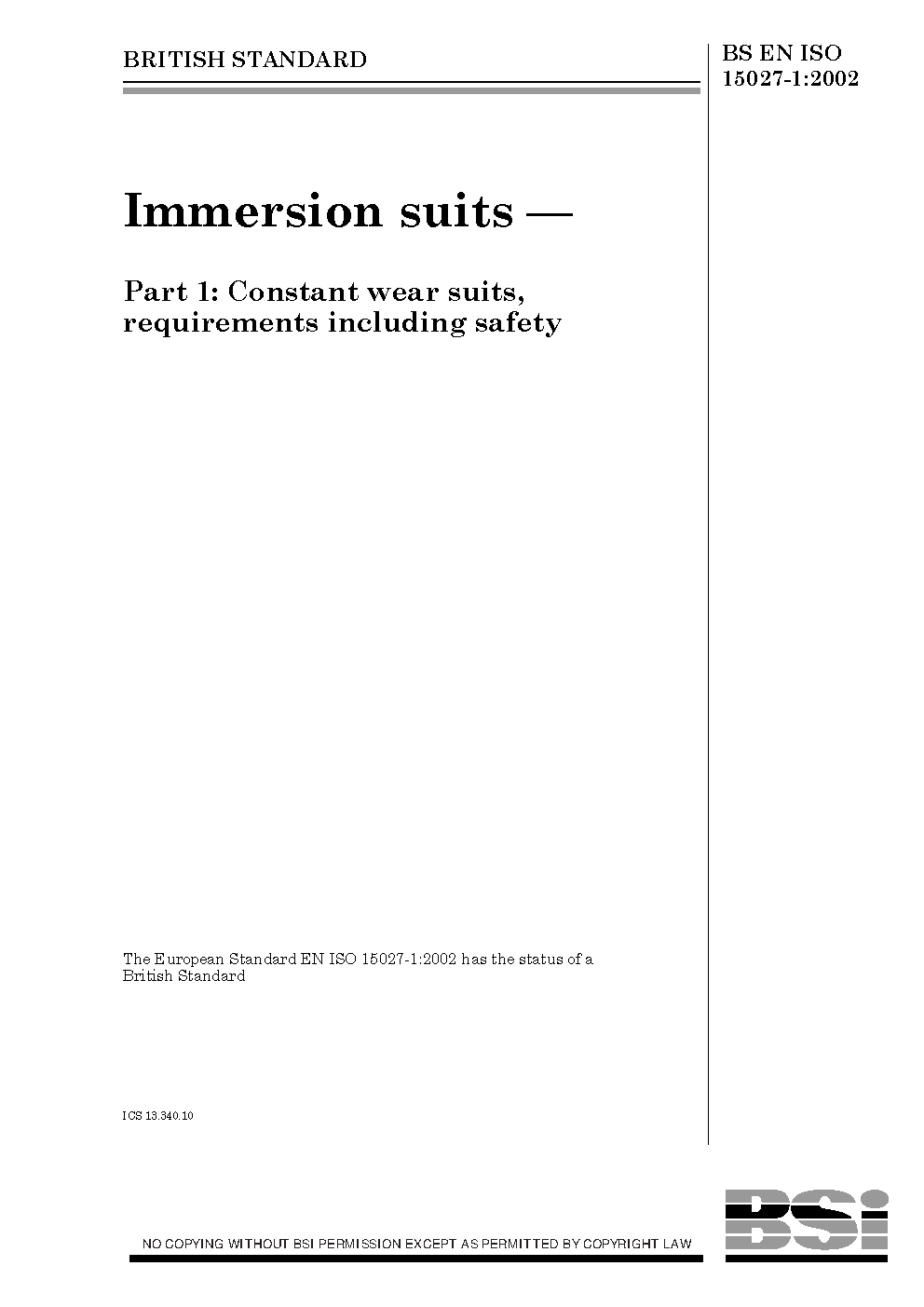 BS EN ISO 15027-1. Immersion suits Part 1. Constant wear suits, requirements including safety