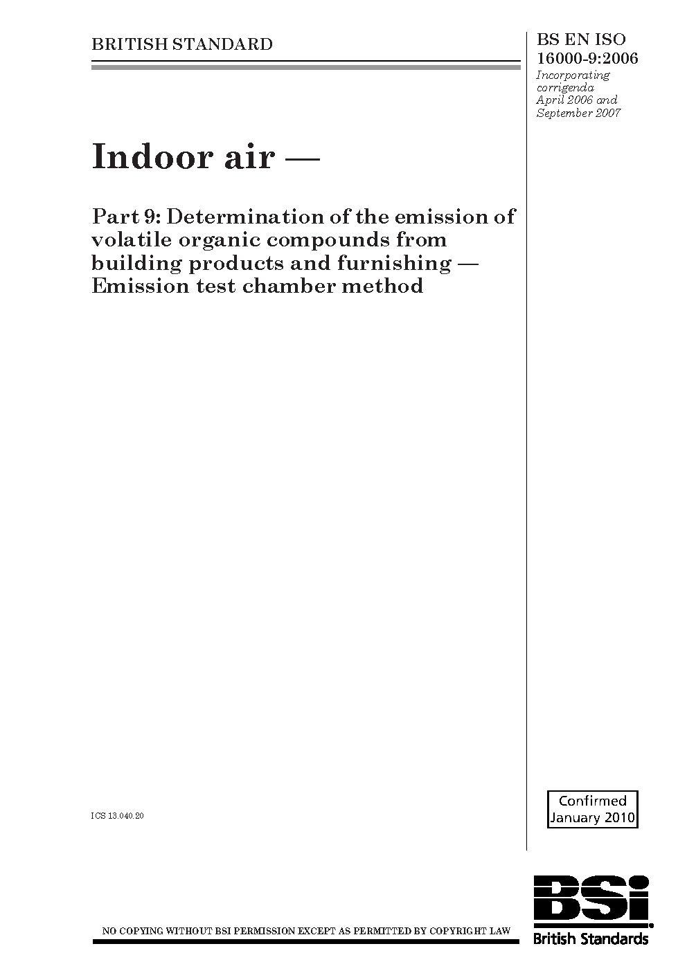 BS EN ISO 16000-9. Indoor air Part 9. Determination of the emission volatile organic compounds from building products and furnishing. Emission test chamber method