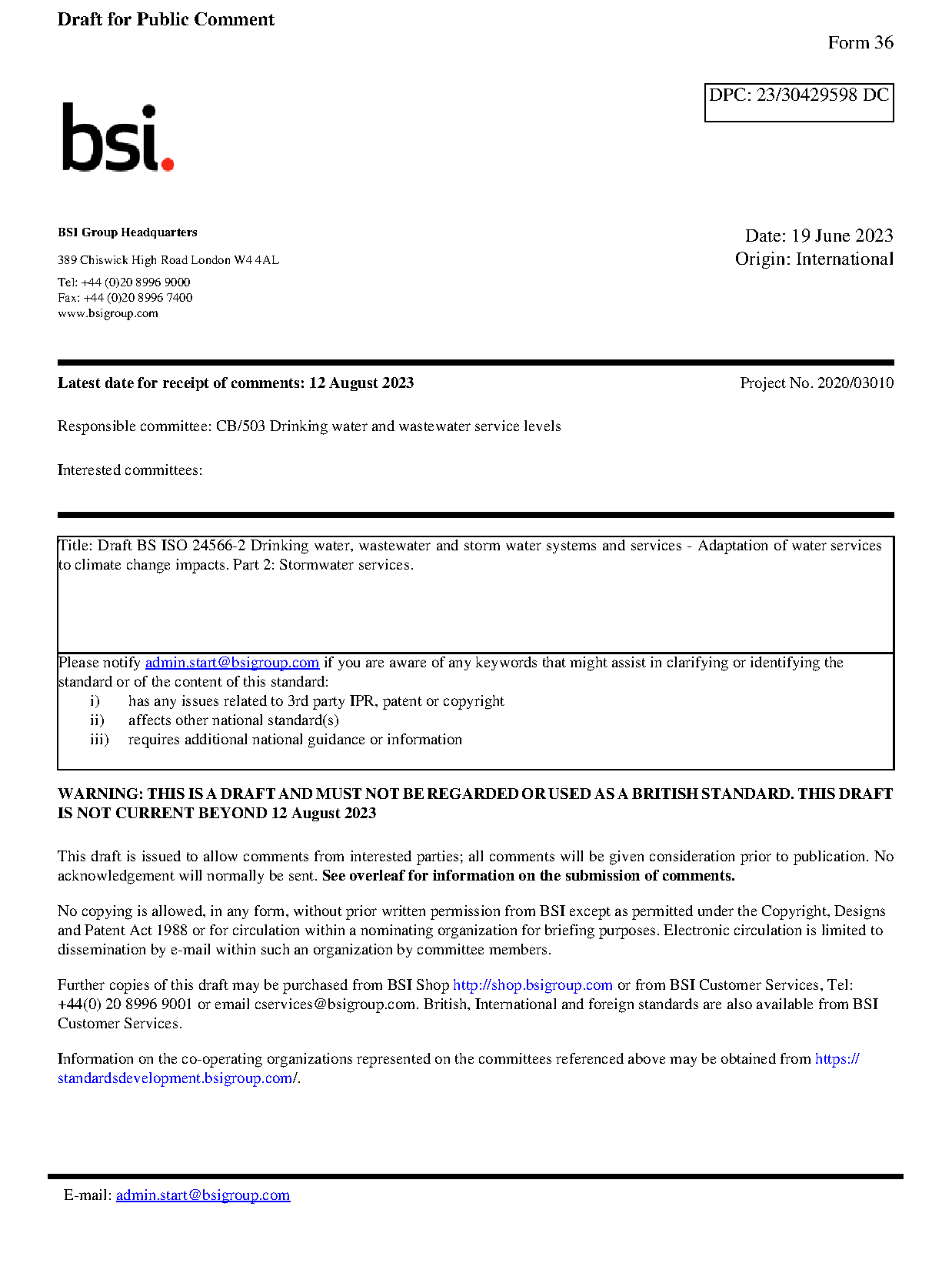 BS ISO 24566-2. Drinking water, wastewater and storm water systems services . Adaptation of to climate change impacts Part 2. Stormwater