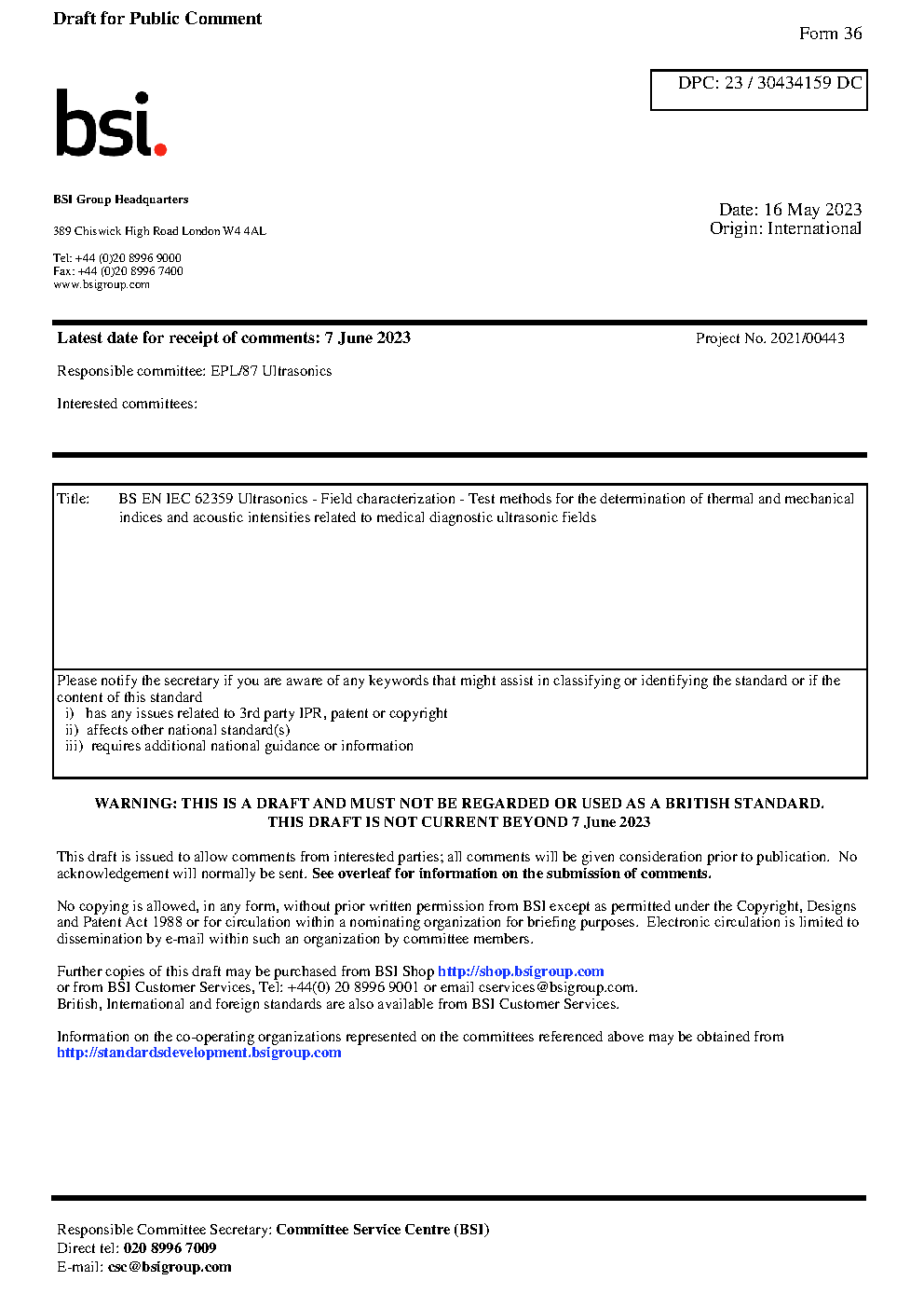 BS EN IEC 62359. Ultrasonics. Field characterization. Test methods for the determination of thermal and mechanical indices and acoustic intensities related to medical diagnostic ultrasonic fields
