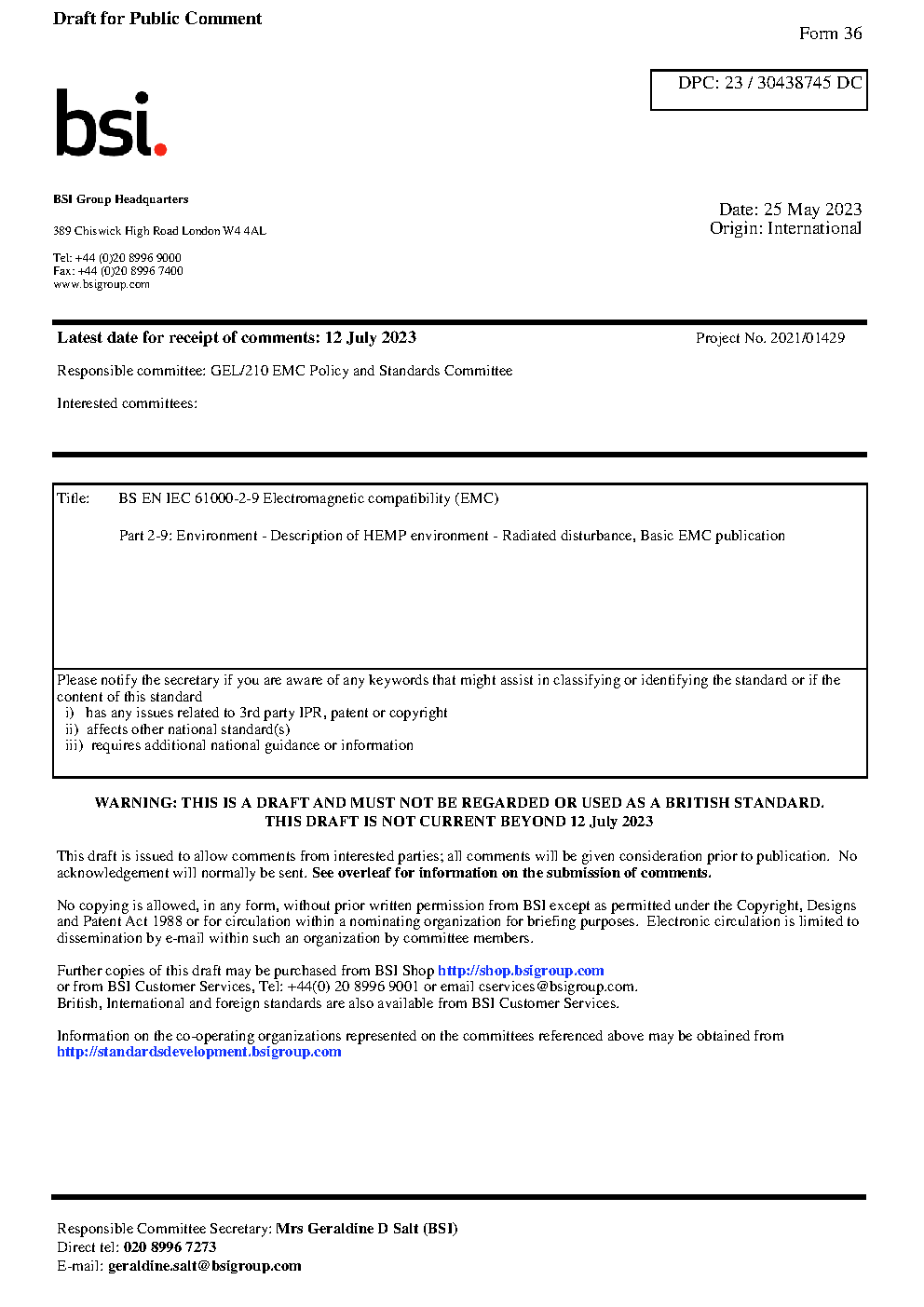 BS EN IEC 61000-2-9. Electromagnetic compatibility (EMC) Part 2-9. Environment. Description of HEMP environment. Radiated disturbance, Basic EMC publication