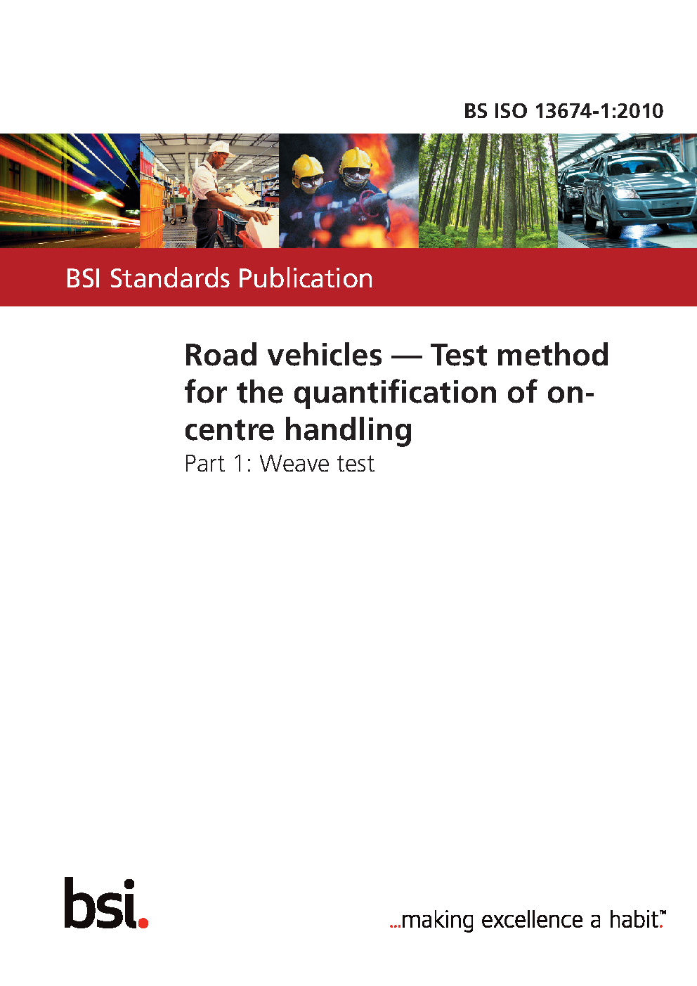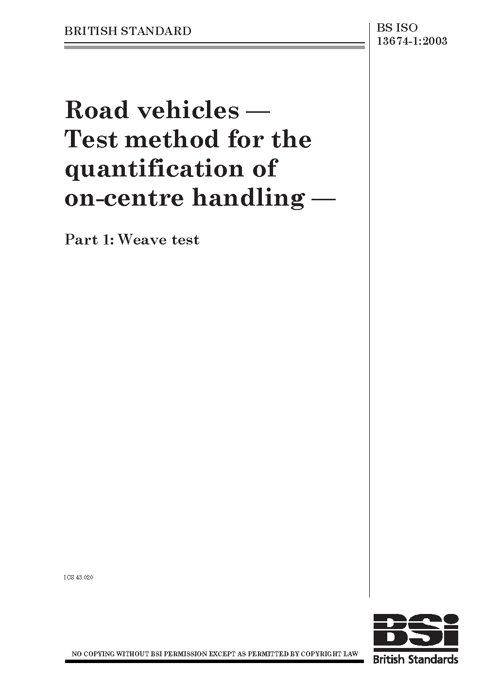 BS ISO 13674-1. Road vehicles. Test method for the quantification of on- centre handling Part 1. Weave test